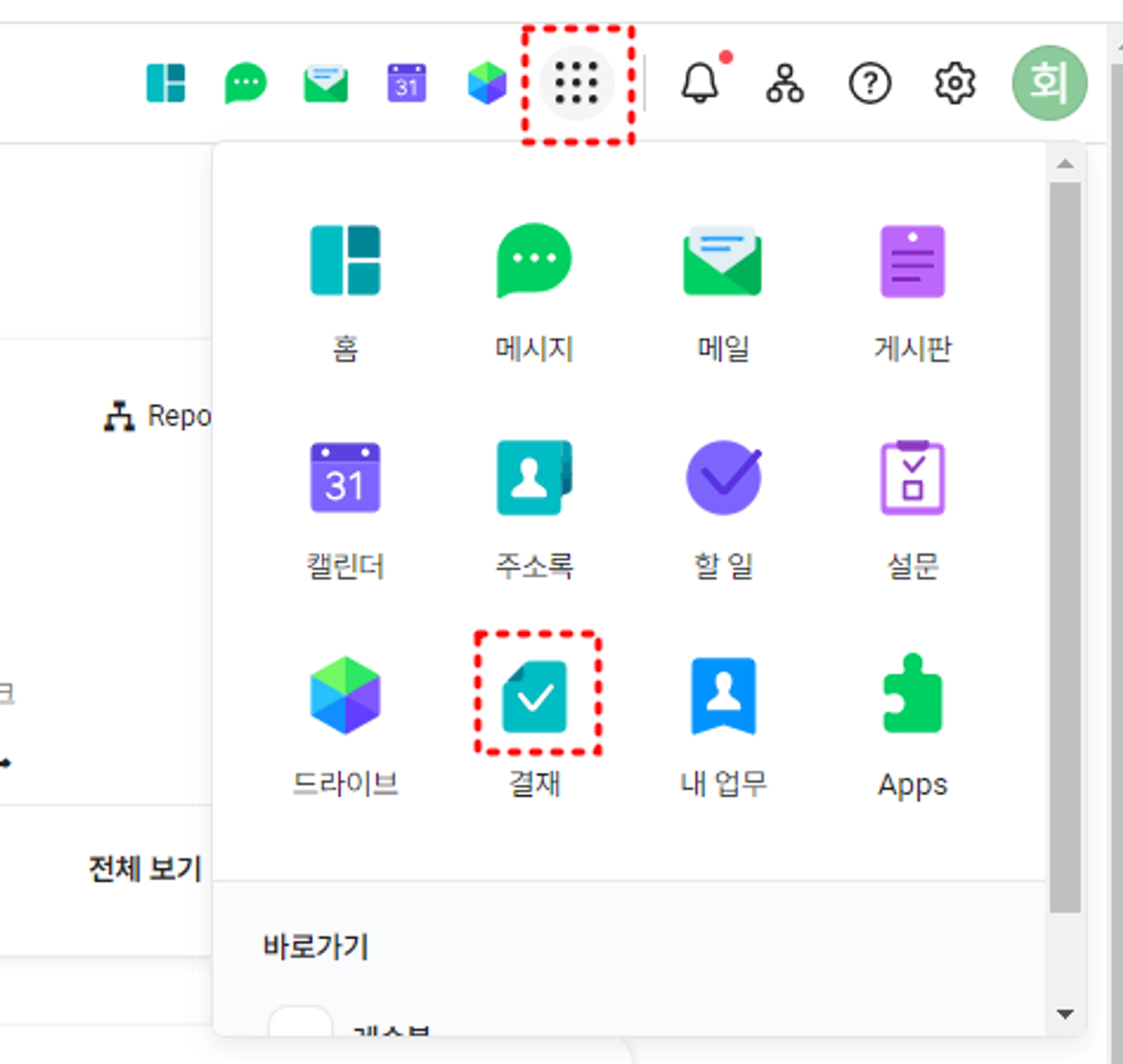 우측 상단 메뉴중 [전체 서비스] > [결재] 를 선택합니다.