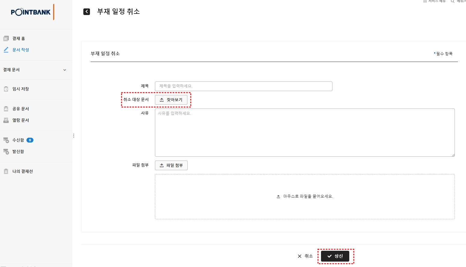 부재 일정 취소 화면에서 제목, 취소 대상 문서 설정 후 [상신] 클릭하면 끝~
