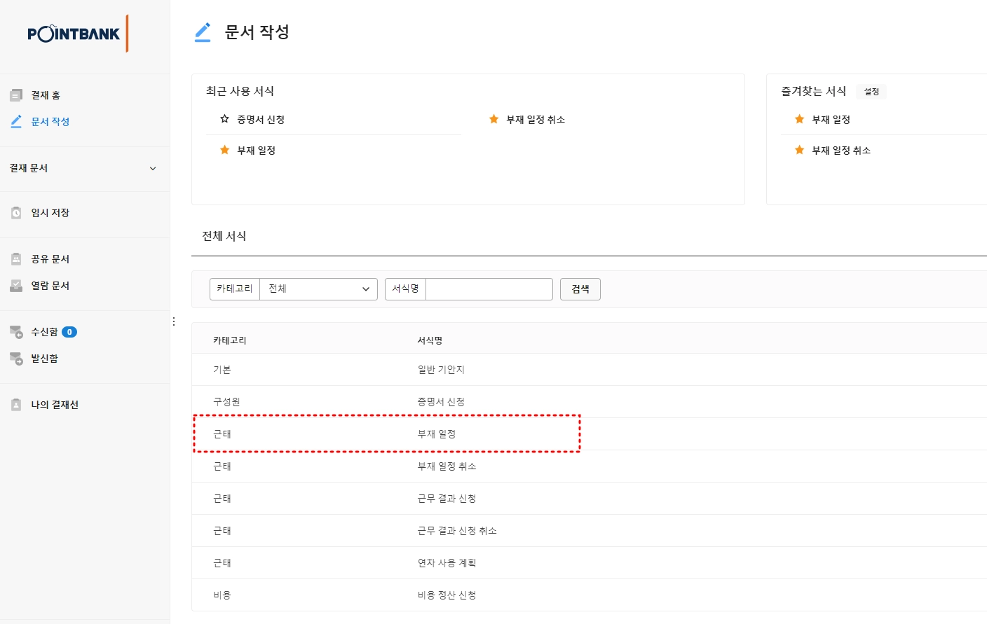 전체 서식 중 [부재 일정]을 선택 합니다.