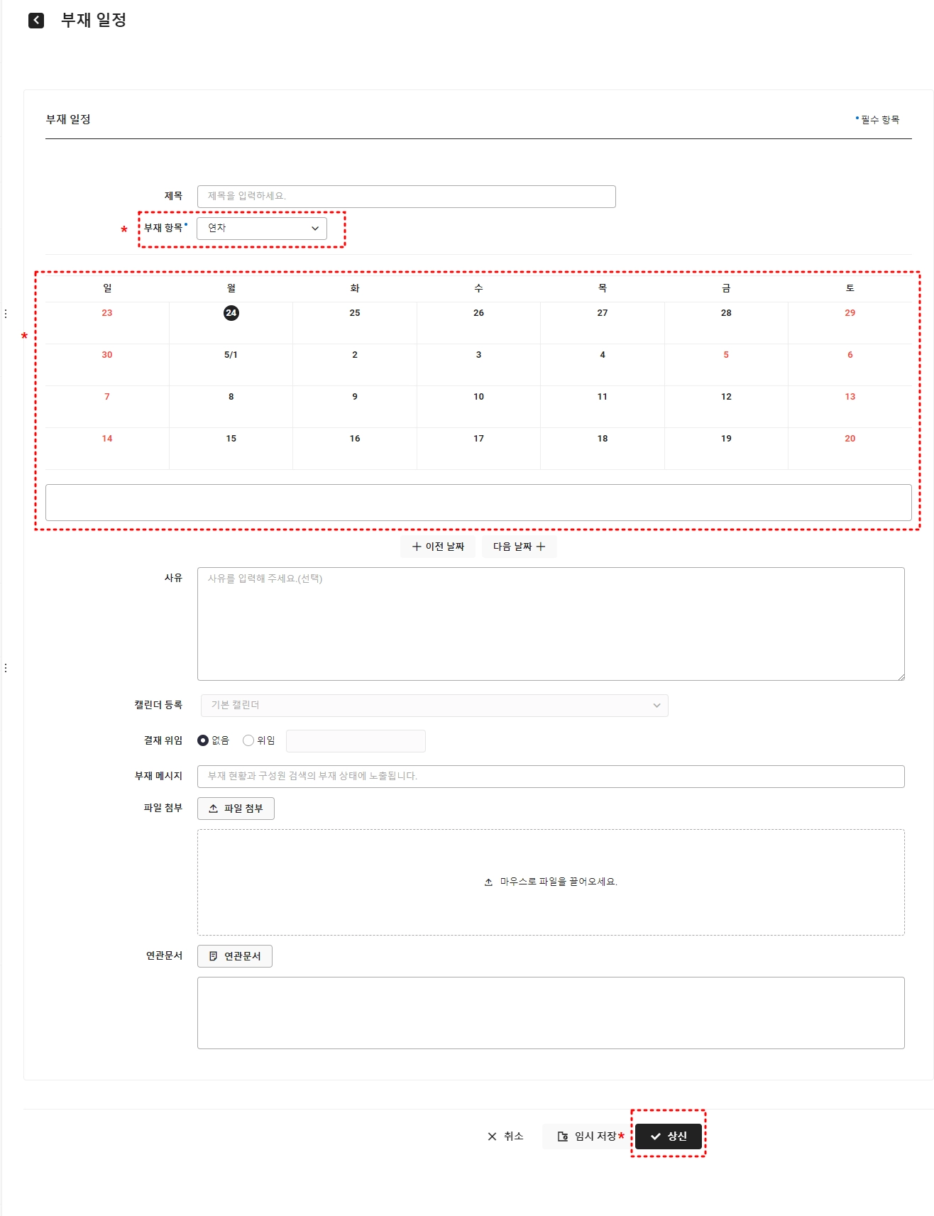 [부재 일정] 화면에서 제목(선택), 부재항목(필수), 부재일정(필수) 입력 및 선택후 상신 버튼 누르면 끝~