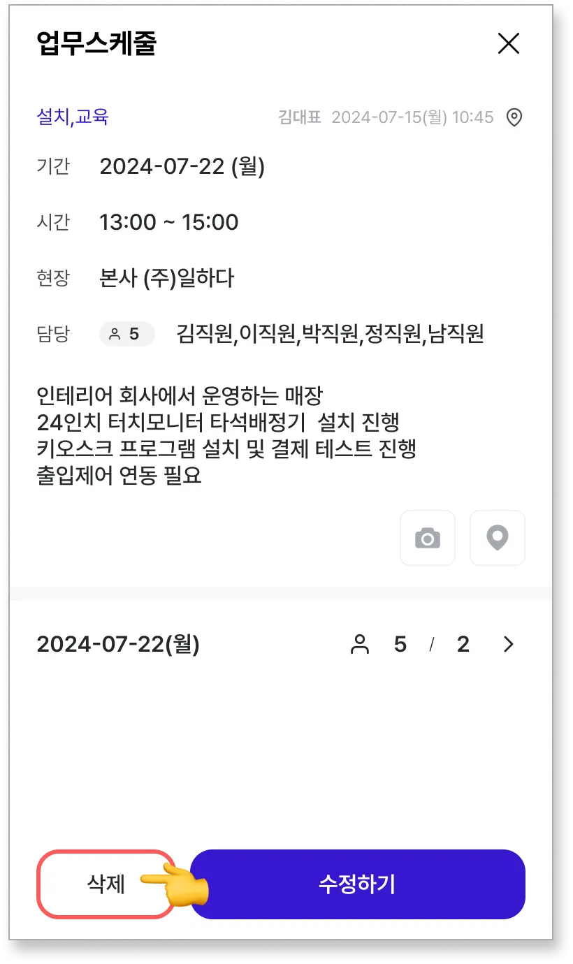 메뉴를 선택하면 등록한 업무스케줄을 삭제할 수 있습니다.