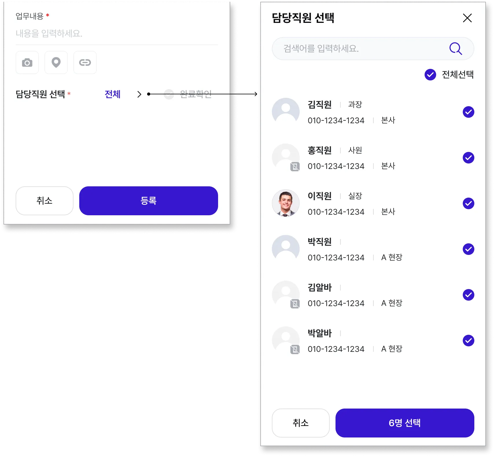 업무를 수행할 직원을 선택합니다. 다수의 직원을 선택할 수 있습니다.