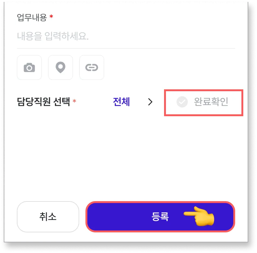 업무스케줄 등록 시 [완료확인] 을 사용으로 설정하면 해당직원은 업무결과를 등록할 수 있고 완료/미완료로 확인 할 수 있습니다.