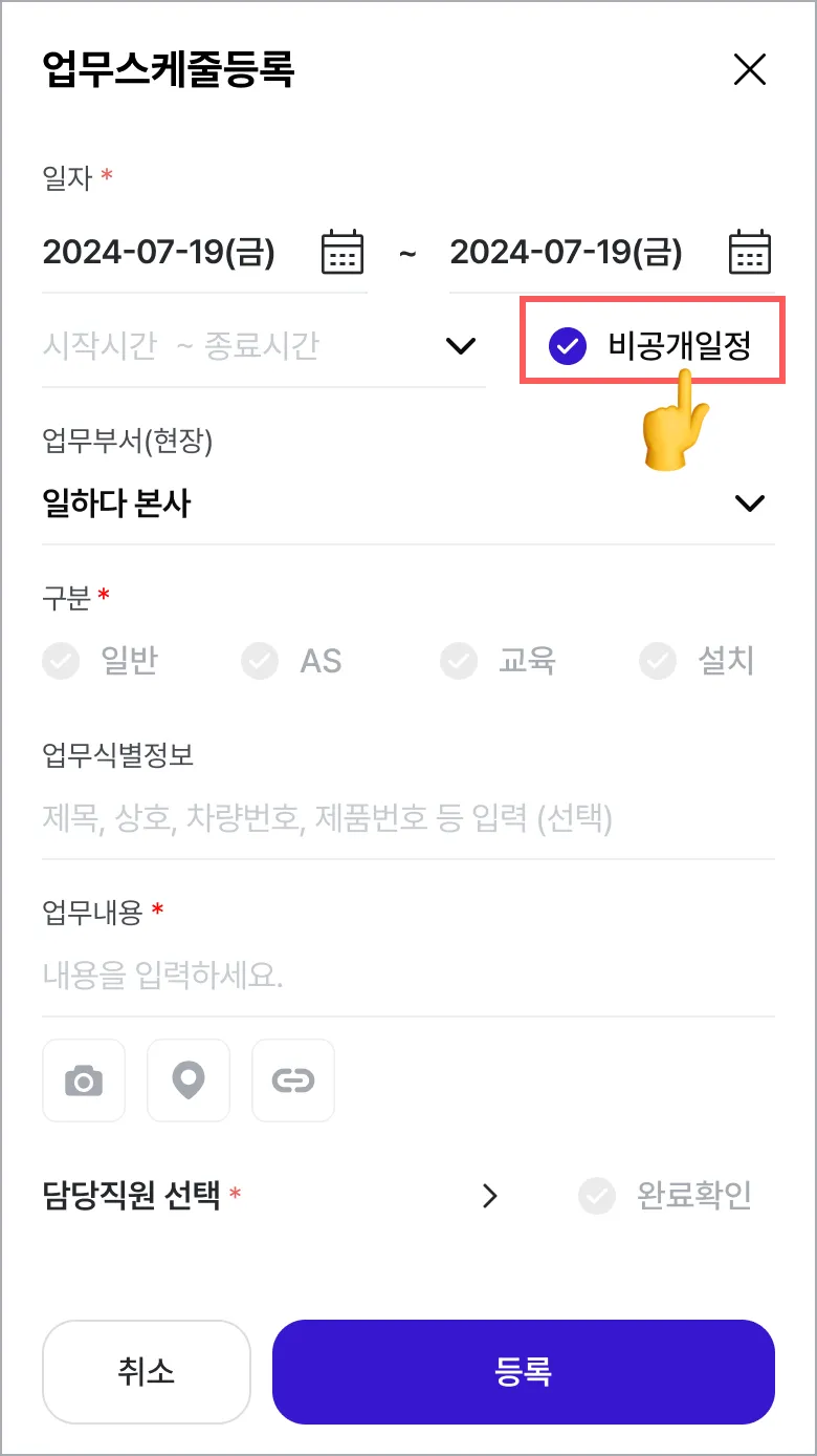 업무일자를 입력하고 비공개일정을 선택합니다.