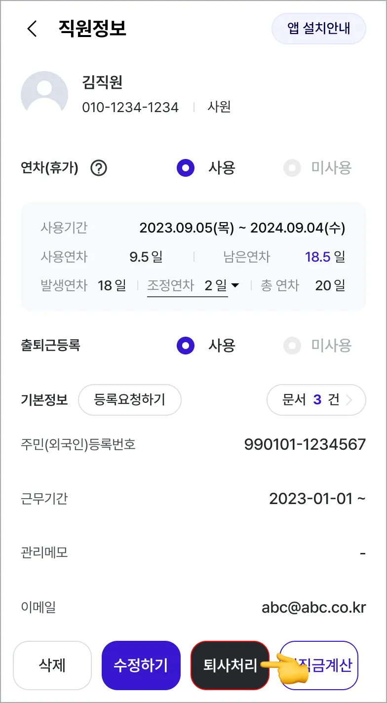 직원정보 하단의 퇴사처리를 선택합니다.