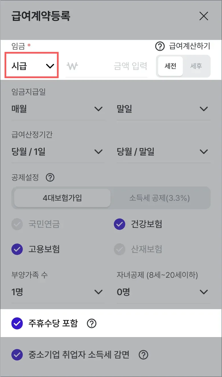 입력한 시급이 주휴수당을 포함할 경우 선택합니다.