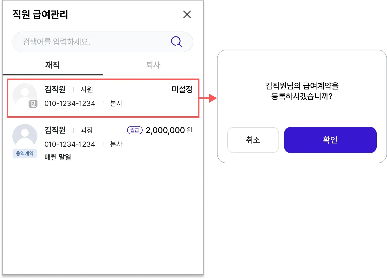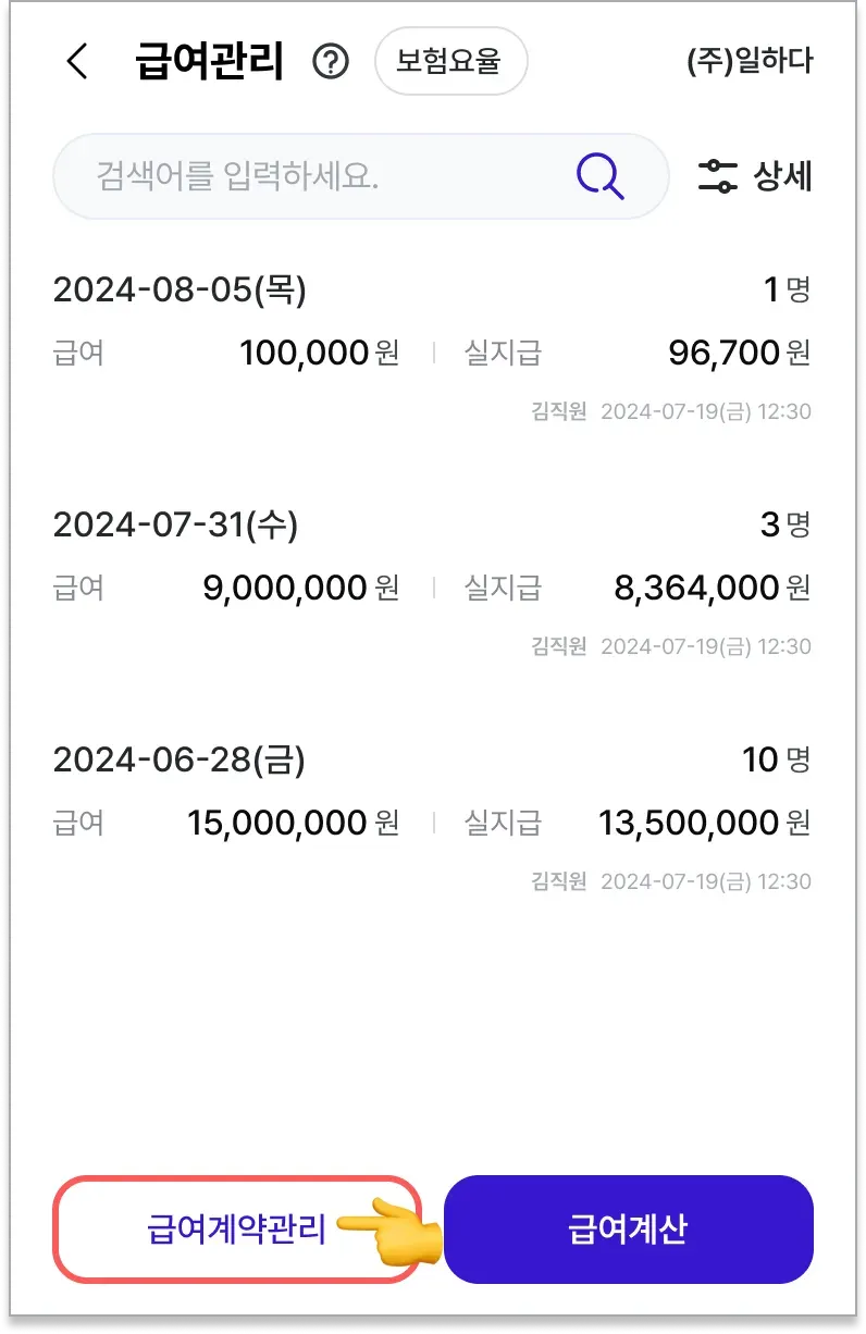 급여 미설정 직원을 선택한 후 급여계약을 등록합니다.