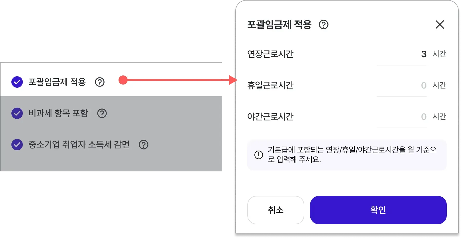 포괄임금제에 포함할 연장/휴일/야간 근로시간을 입력 후 확인을 선택합니다.