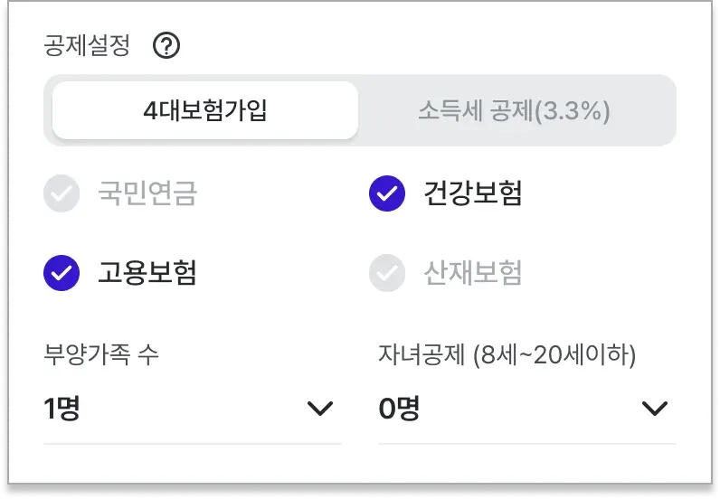 급여 공제조건은 4대보험 공제 또는 3.3% 소득세 공제로 선택할 수 있습니다.