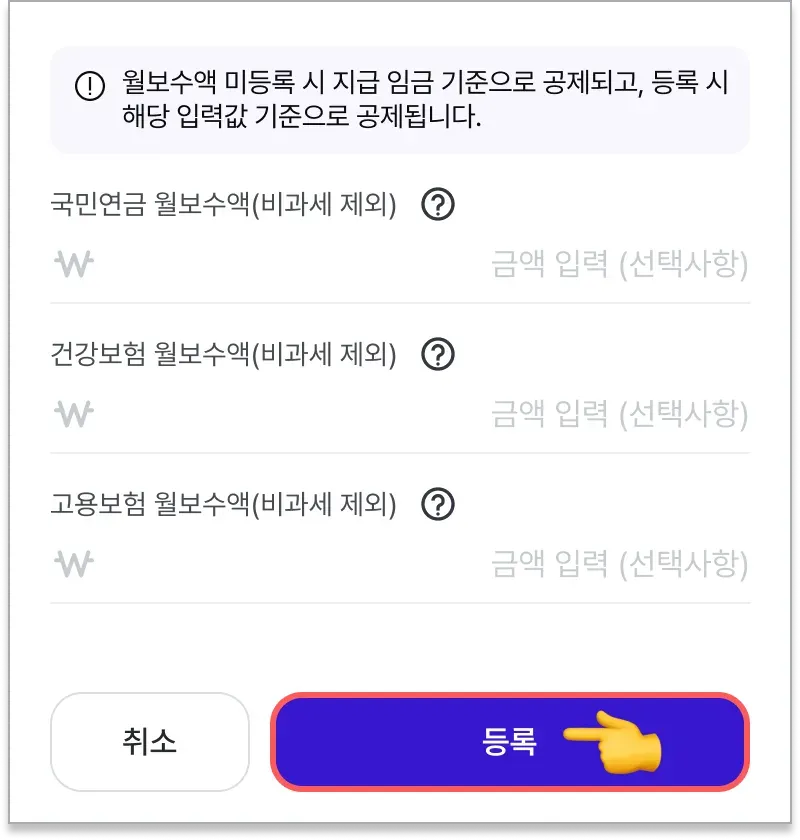 국민연금, 건강보험, 고용보험의 월 보수액을 입력 후 등록을 눌러 완료합니다.