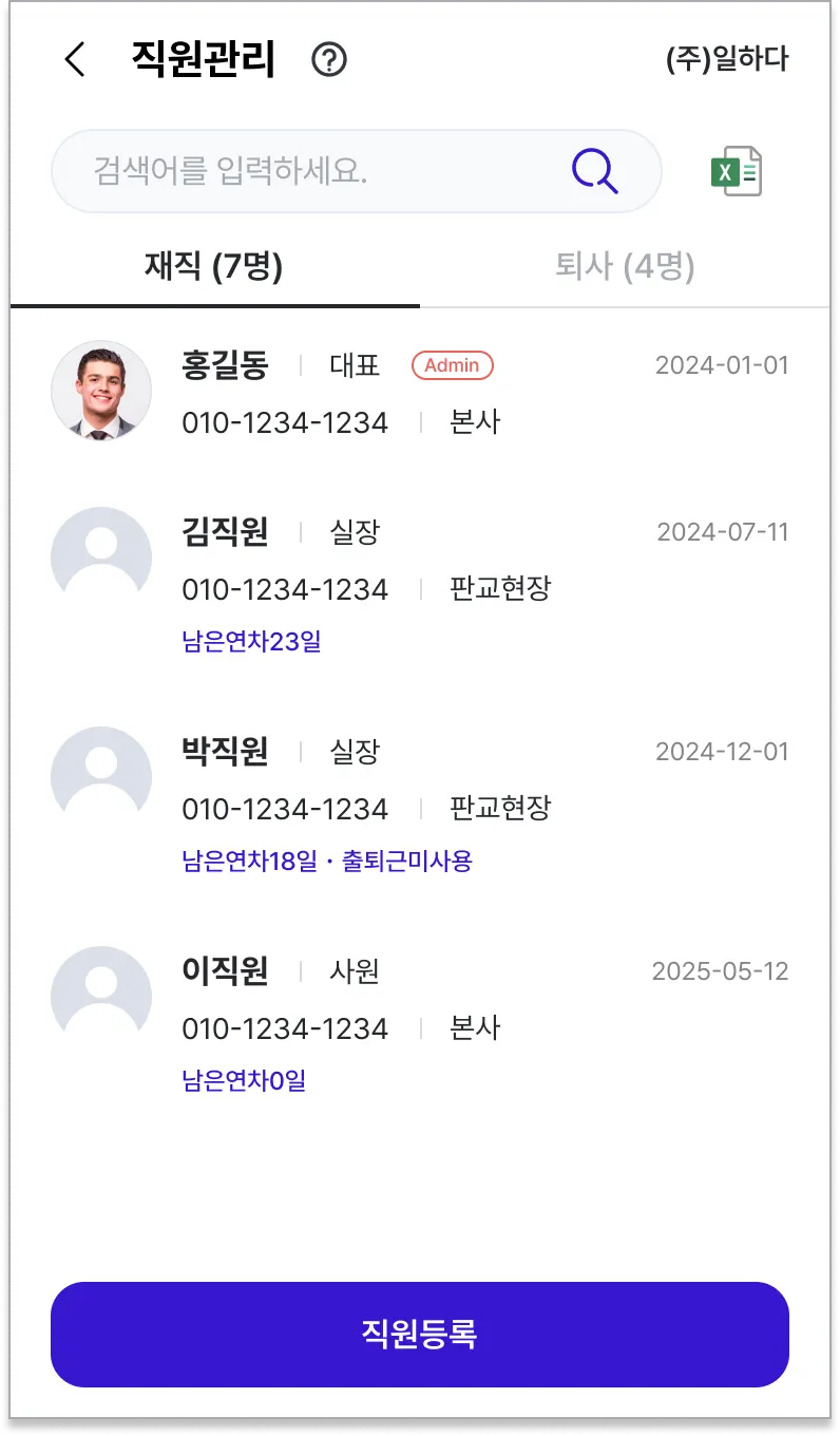 근로계약서 작성전 직원을 등록할 수 있고, 근로계약서를 작성한 직원은 별도의 절차 없이 자동으로 등록됩니다.