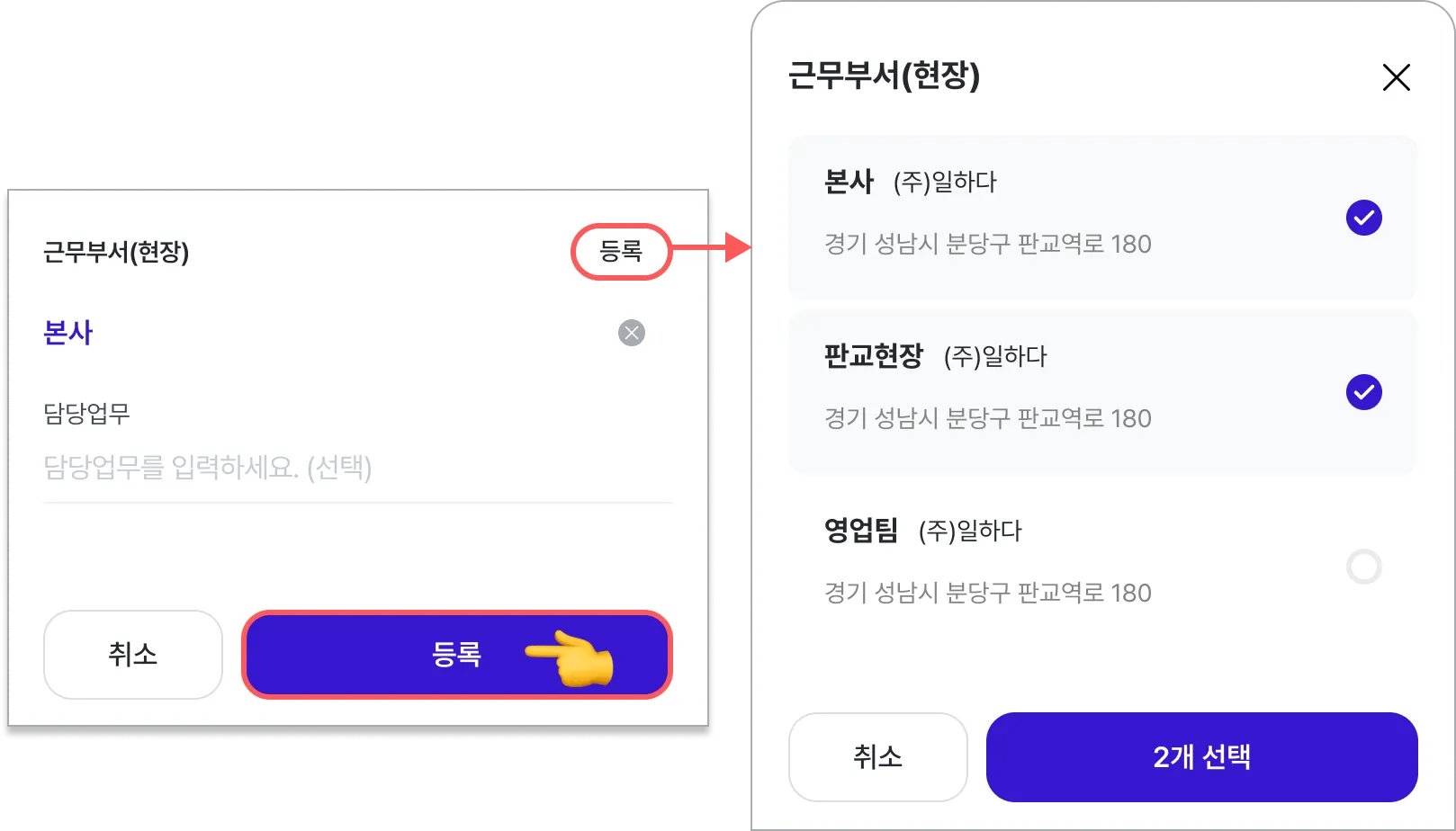 직원이 근무할 부서(현장)를 선택 후 등록을 눌러 완료합니다.