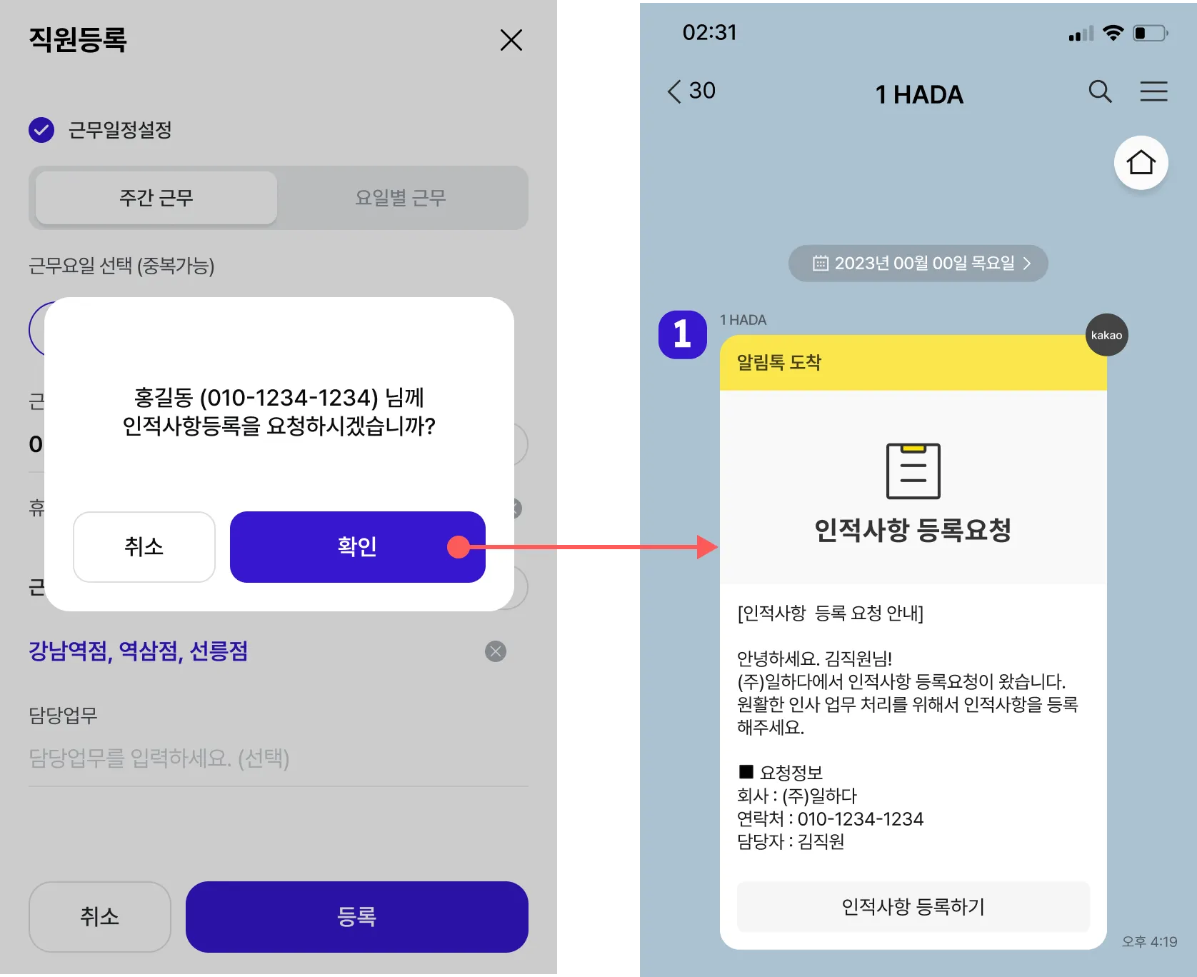 요청은 카카오톡 알림톡으로 발송되며, 링크를 통해 직원이 직접 등록할 수 있습니다.