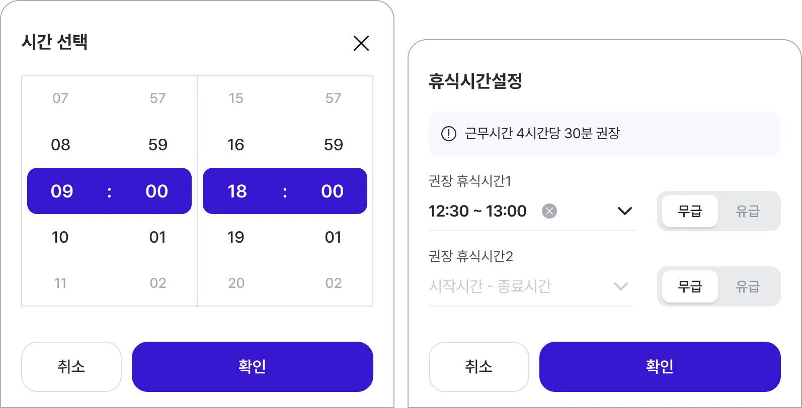 휴식시간은 무급/유급 휴식시간으로 입력할 수 있으며, 유급으로 선택한 경우 휴식시간도 급여계산에 반영됩니다.