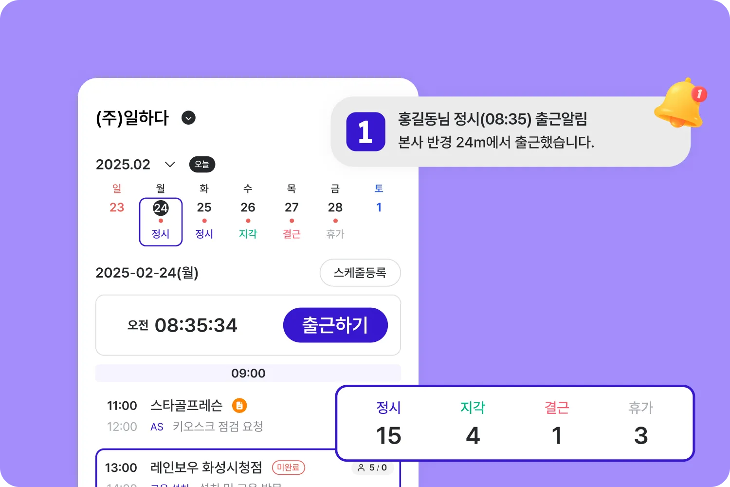 직원이 출•퇴근등록을 하면 관리자 알림을 통해 실시간으로 확인이 가능합니다.
