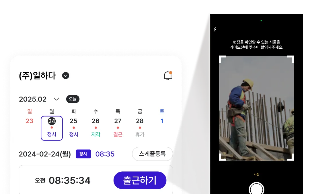 빠르고 간편하게 출근등록이 가능합니다. 출근현장 촬영을 통해 더욱 정확한 출근정보 확인이 가능합니다.