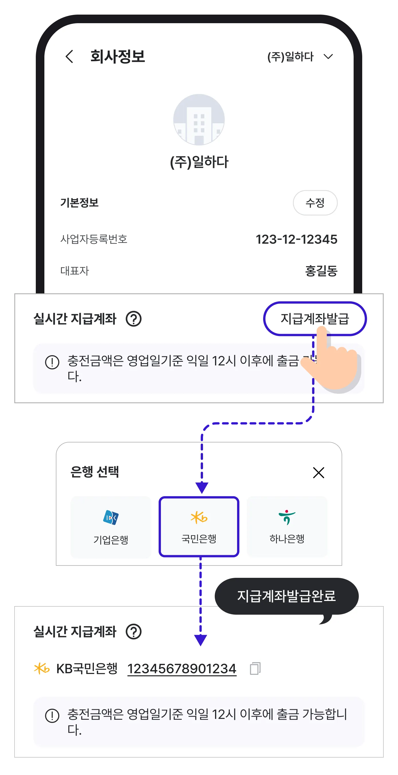 [회사정보] → 지급 계좌 발급받기