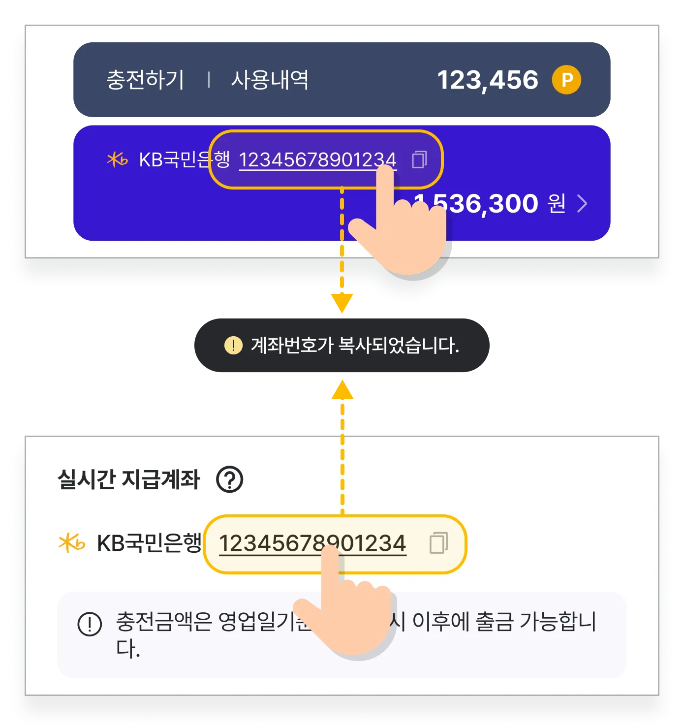 계좌번호를 선택하면 자동으로 복사되며, 은행 송금 시 붙여넣기로 사용할 수 있어요.