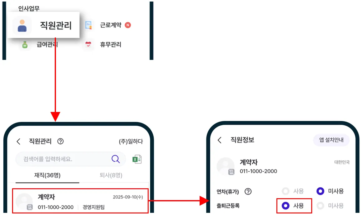 [직원관리]에서 해당직원을 선택한 후 춭퇴근등록을 사용으로 설정하시면 됩니다.