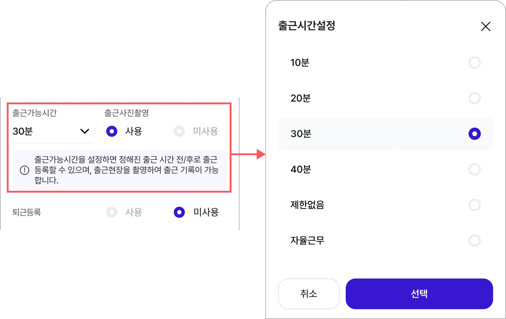 출근 가능 시간이란. 직원이 출근 처리를 할 수 있는 시간 범위를 의미합니다.
