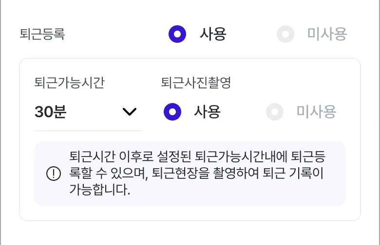 퇴근 등록 사용 여부와 사용 시 사진촬영 등록 여부를 설정합니다.