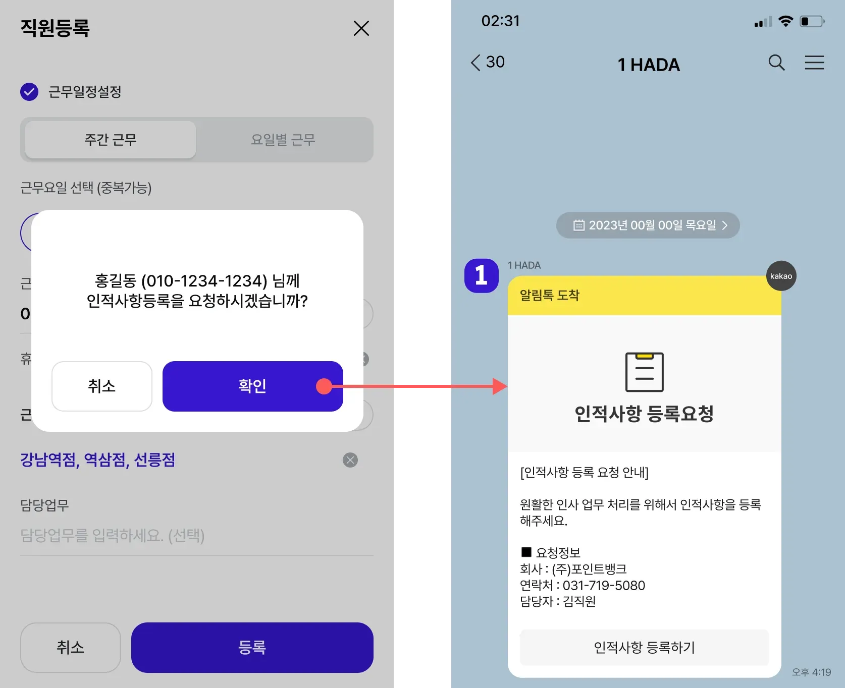 이후 직원에게 카톡으로 인적사항등록을 요청할 수 있습니다