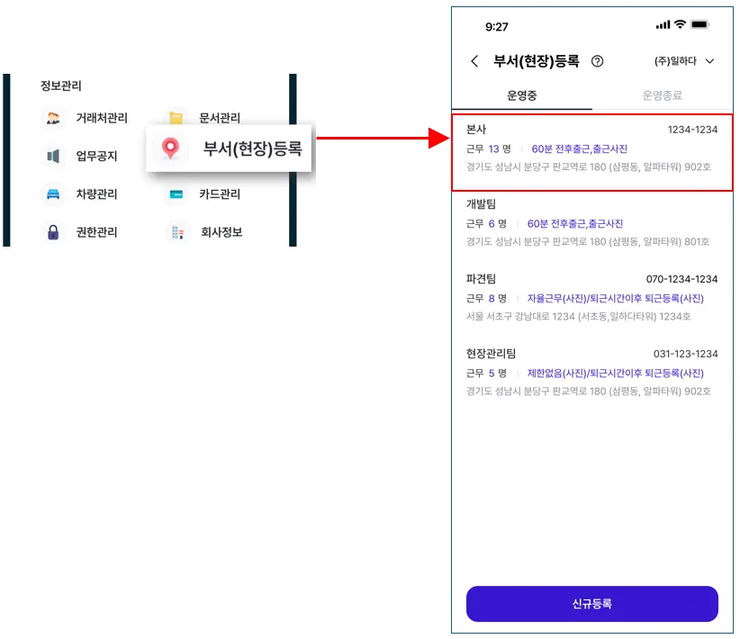 1. 부서(현장)을 선택