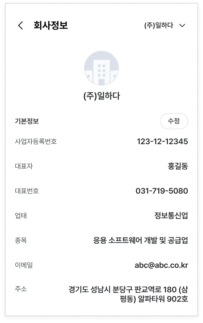 회사의 기본정보는 근로계약서, 세금계산서/현금영수증의 공급자 정보로 표시되며, 회사 직인 또는 전자서명을 등록하면 근로계약서의 사업주 서명란에 자동 반영됩니다.