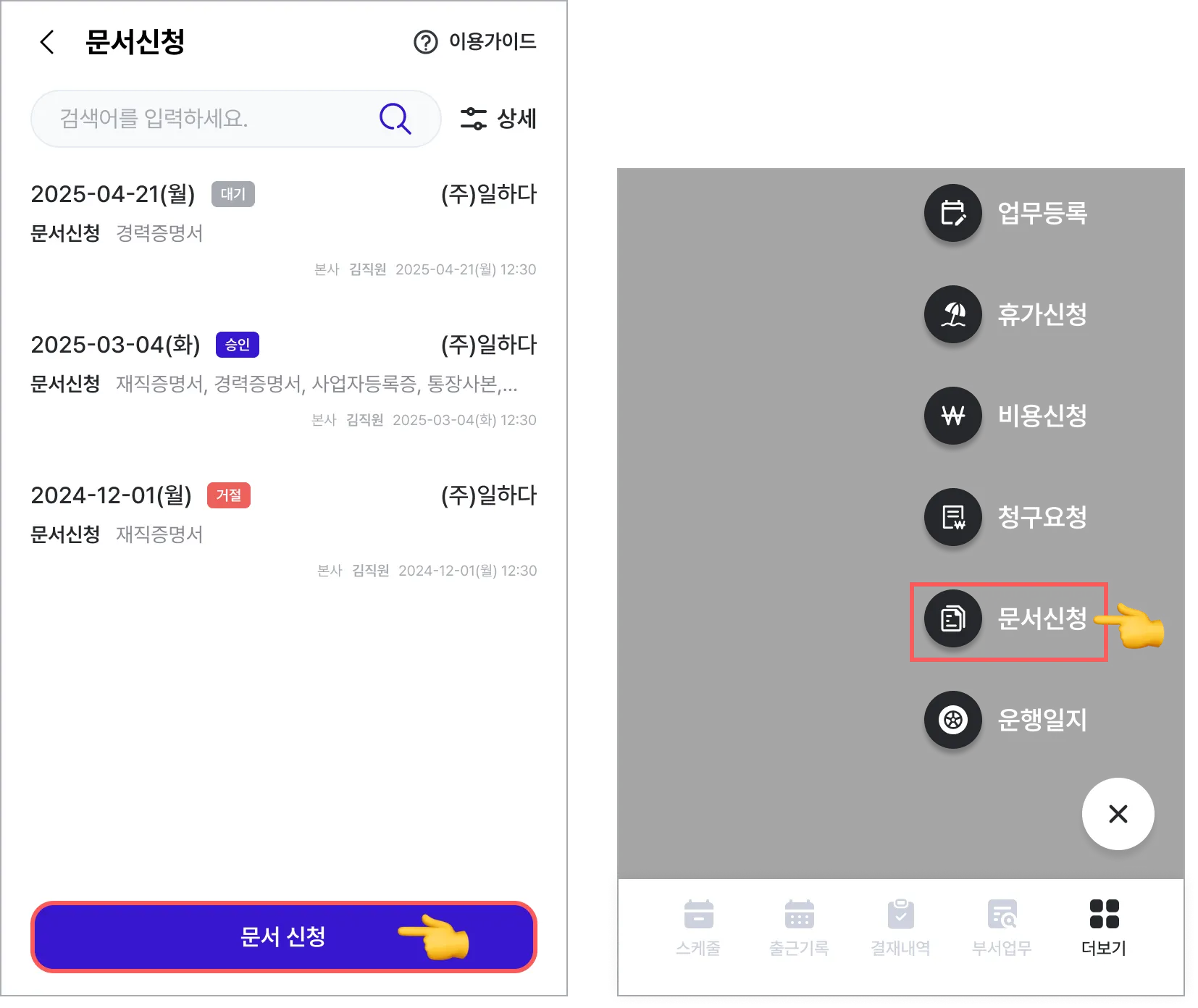하단 [결재내역] 또는 더보기 > 마이페이지 [문서신청]에서 확인하고자 하는 문서를 선택합니다.