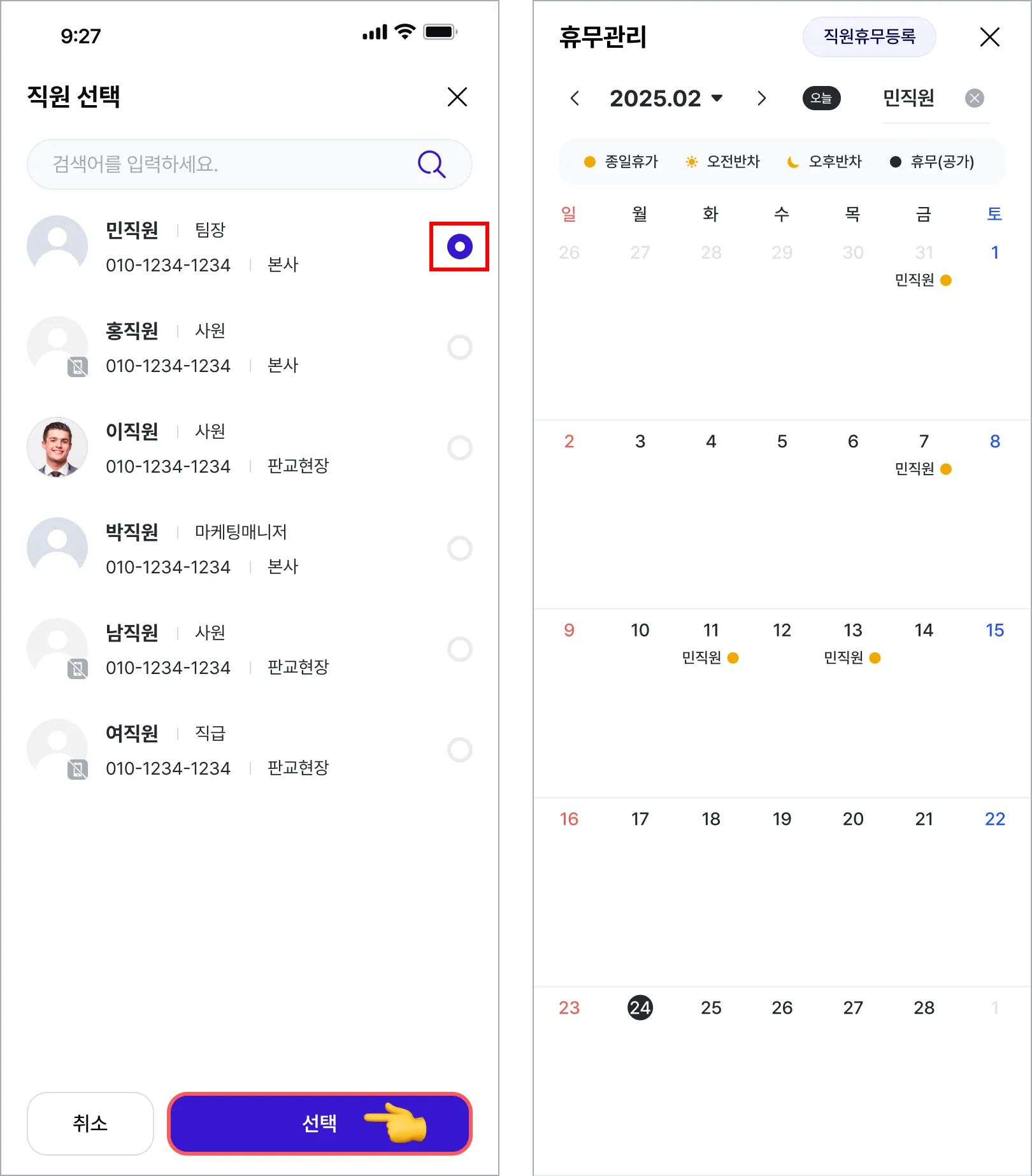 직원을 선택한 후 선택을 클릭하면 해당 직원의 휴무/휴가 현황을 확인할 수 있습니다.