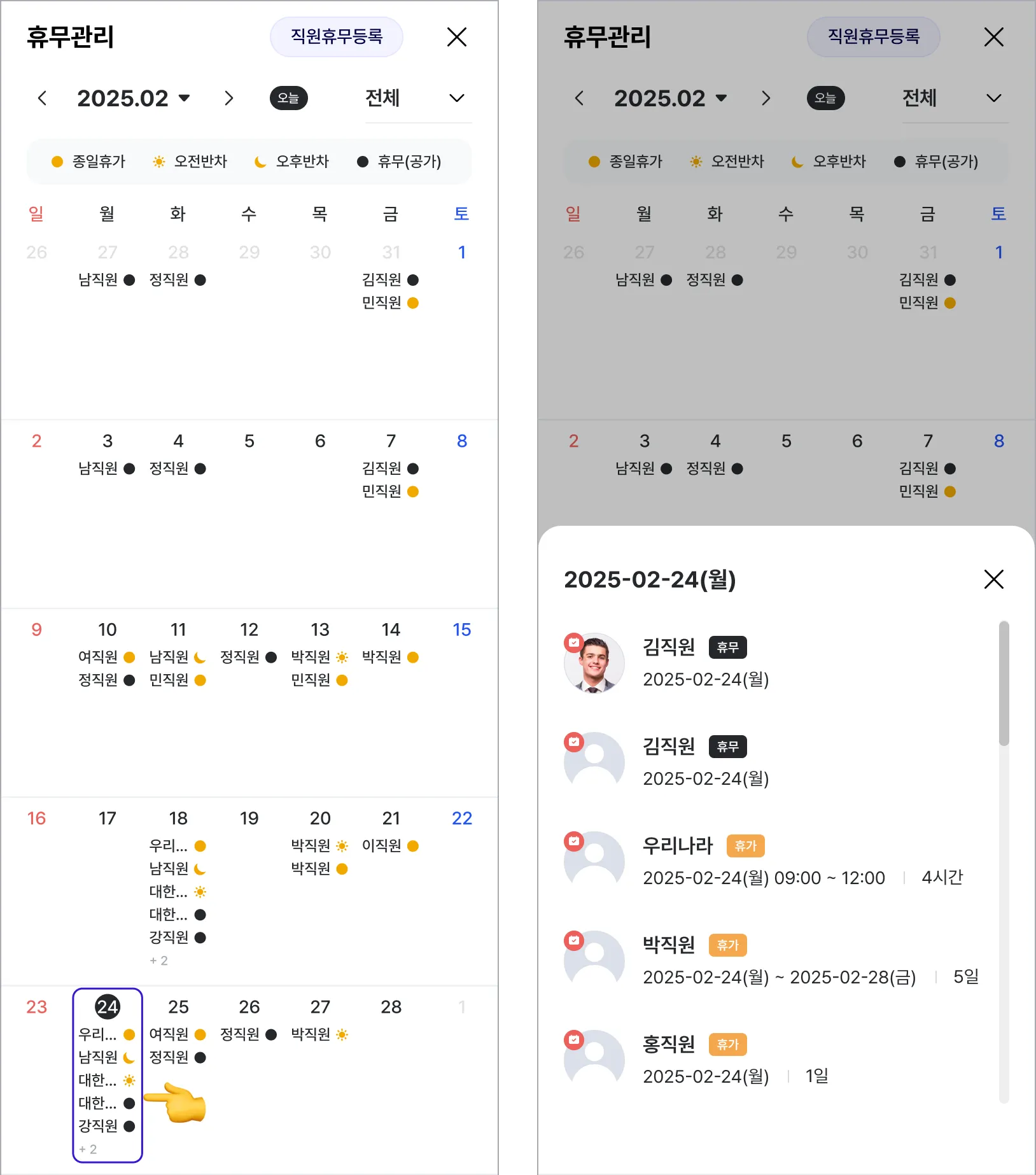 일자를 선택하면 당일 휴무/휴가자 상세현황을 확인할 수 있습니다.