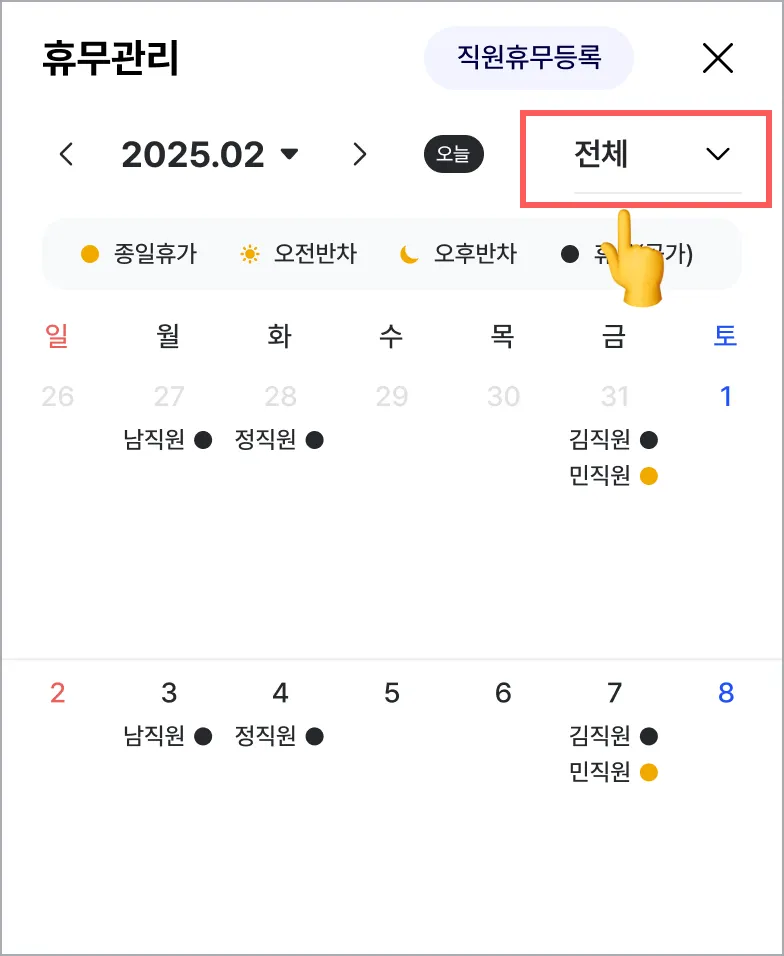 ❷ 직원 필터 : 전체 또는 직원 개별 선택을 통해 특정 직원의 휴무 또는 휴가 정보를 확인할 수 있습니다.