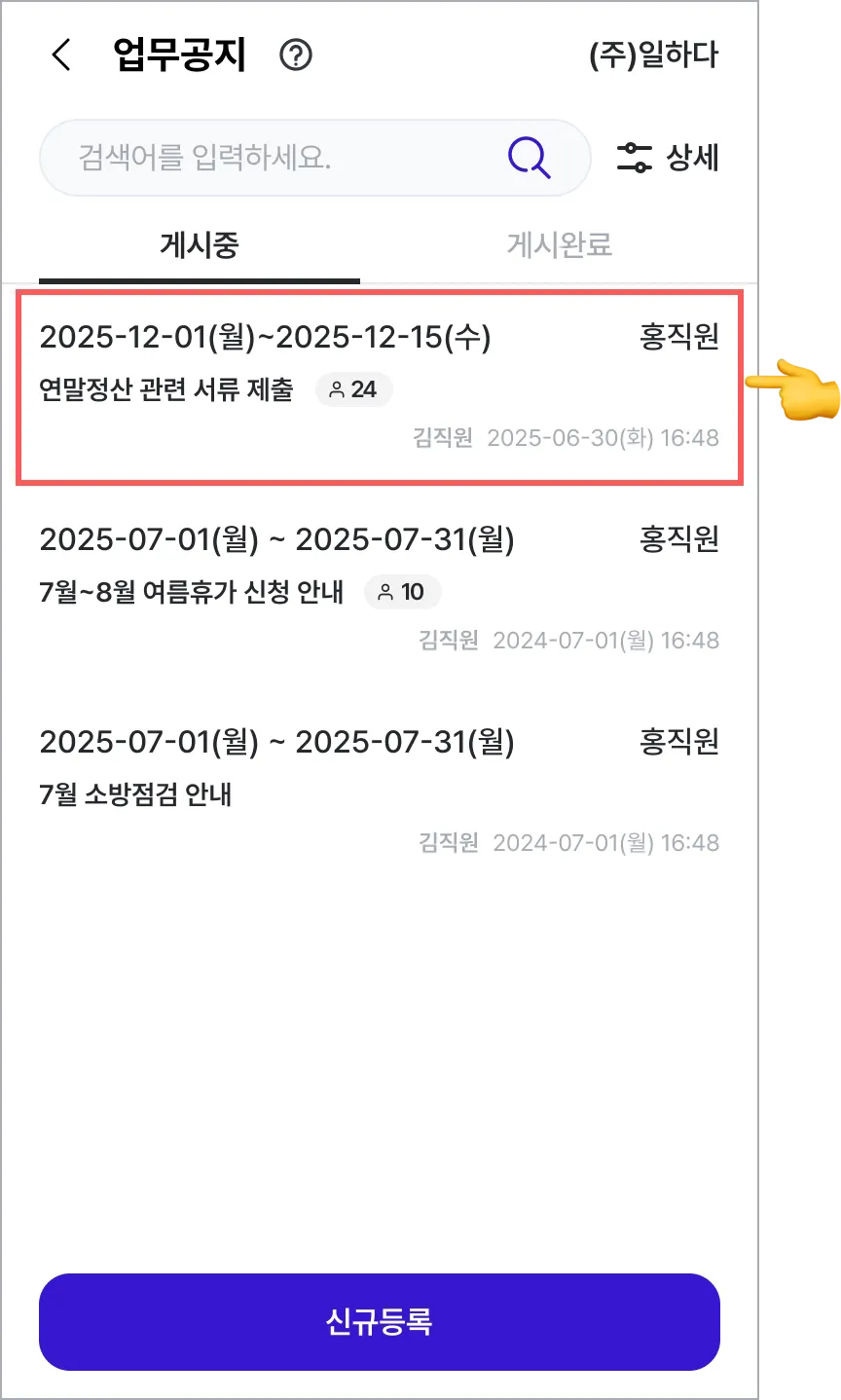 업무공지 목록에서 확인할 업무공지를 선택합니다.