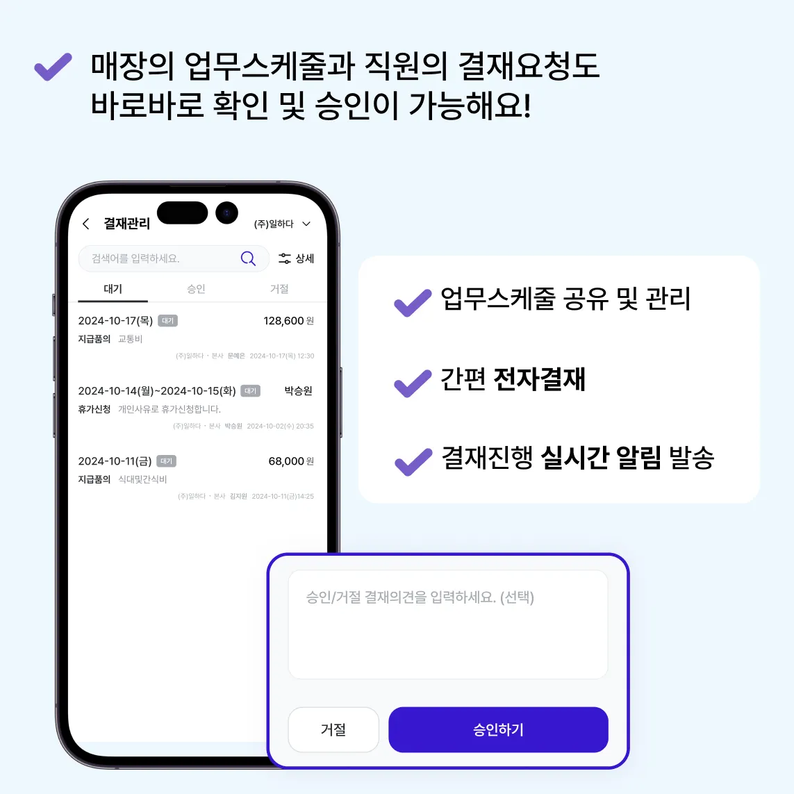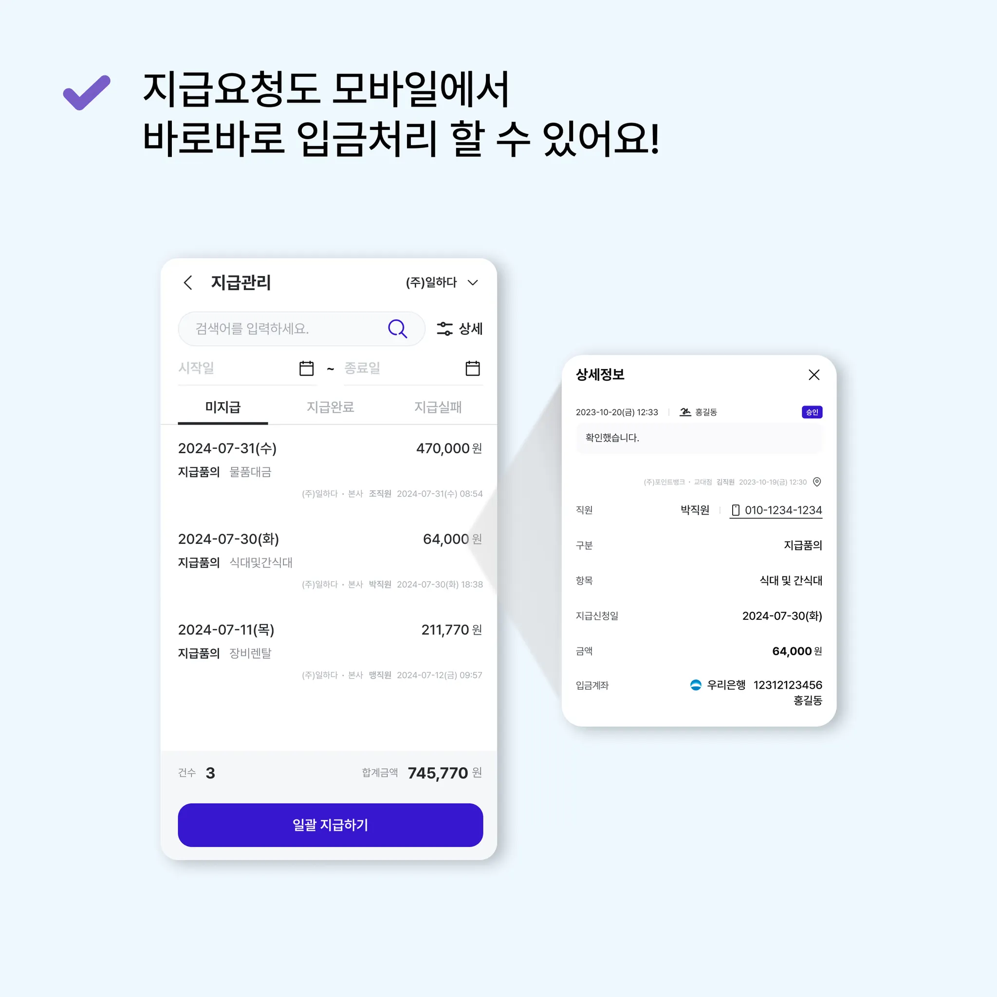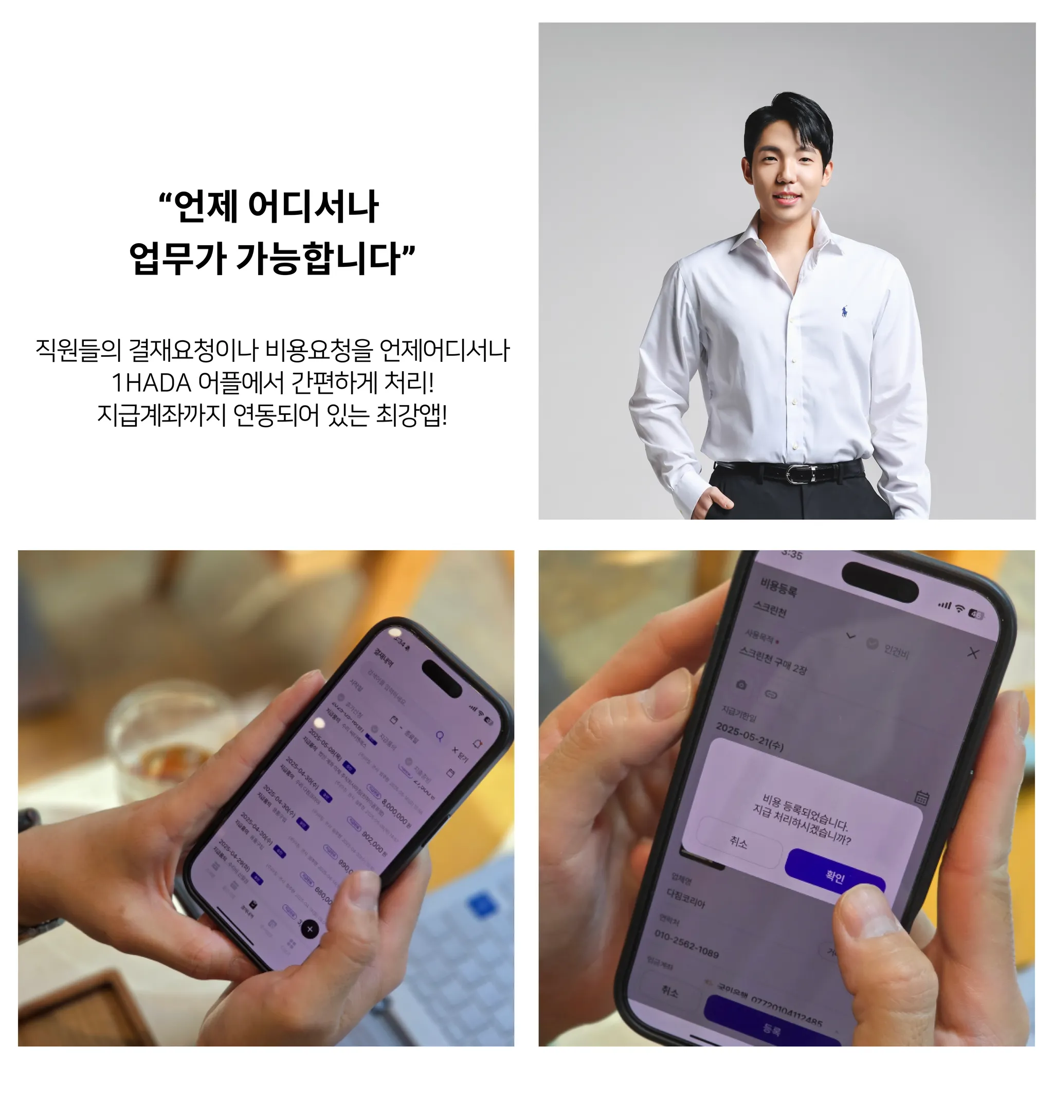 그럼 저는 은행 앱을 열고, 송금하고, 완료됐다고 다시 알려주고… 이런 걸 하루에도 몇 번씩 반복했죠. 깜빡하는 일도 있어서 업체에서 연락이 오고 또 불필요한 대응을 했어야 했죠. 그런데, 1HADA를 쓰고 나선 완전히 바뀌었어요. 직원이 1HADA에서 제공하는 그룹웨어에서 지급신청을 올리면, 앱에서 알림이 오고 승인만 누르면 바로 송금까지 됩니다. 더 이상 전화나 카톡으로 주고받을 일이 없어요. 시간도 아끼고, 실수도 없고, 서로가 편해졌죠.