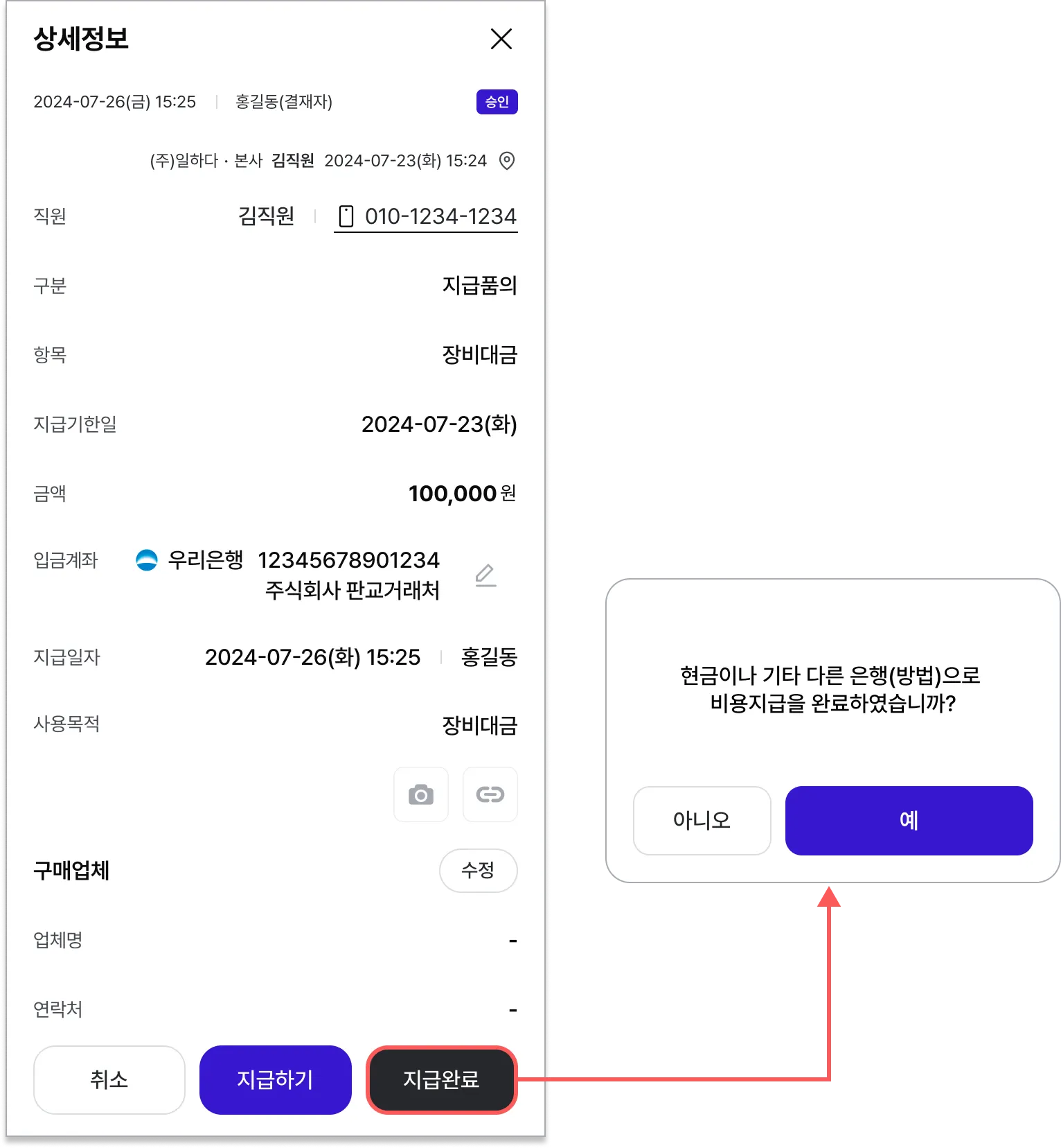일하다 지급계좌가 아닌 현금이나 기타 다른 은행으로 이체하였을 때 수동으로 지급완료처리를 해야합니다.