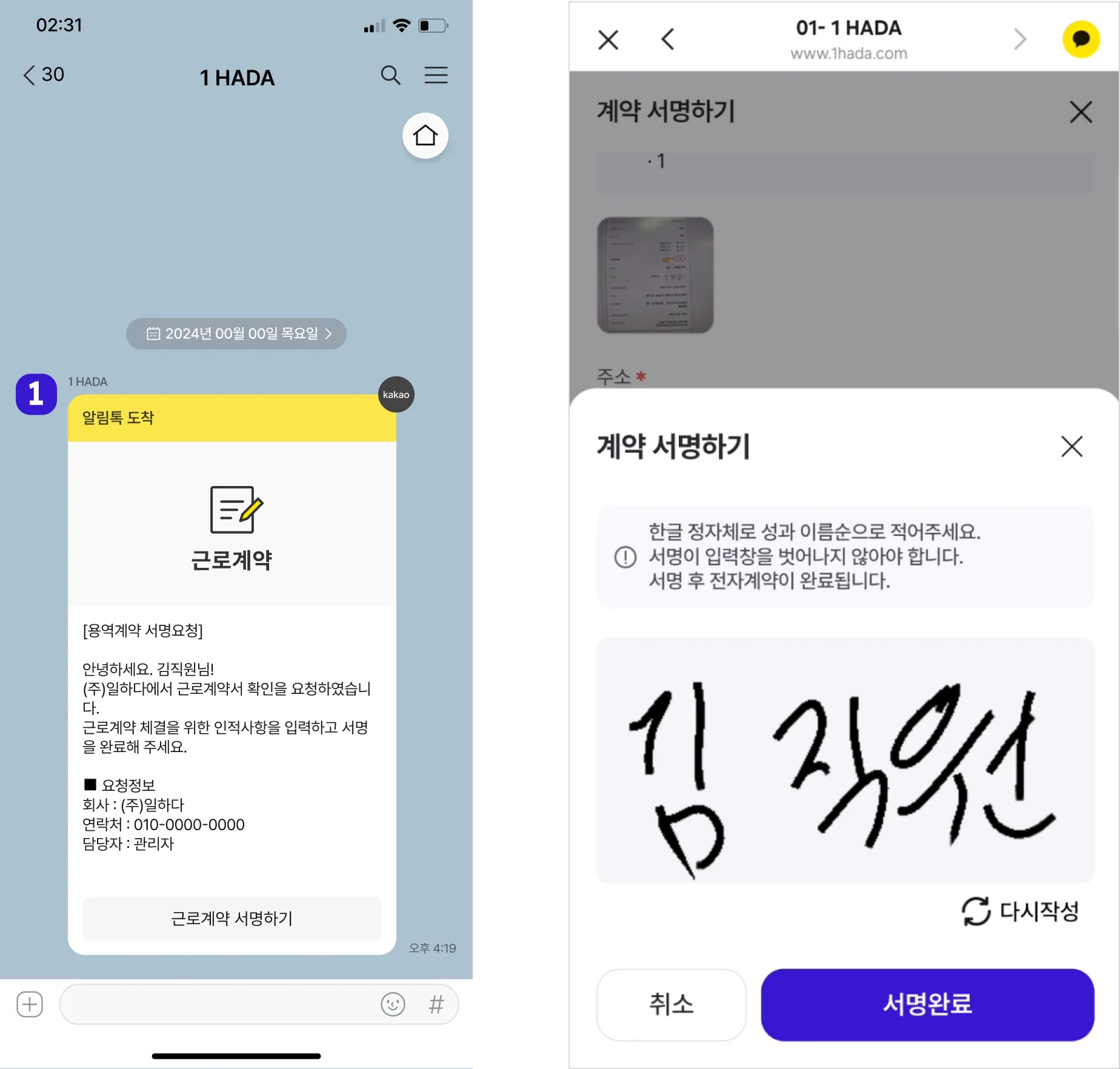 계약서는 해당직원의 알림톡으로 전송되며, 직원은 본인의 인적사항을 입력하고 바로 서명을 할 수 있습니다. 서명여부는 근로계약의 서명상태로 확인할 수 있습니다.