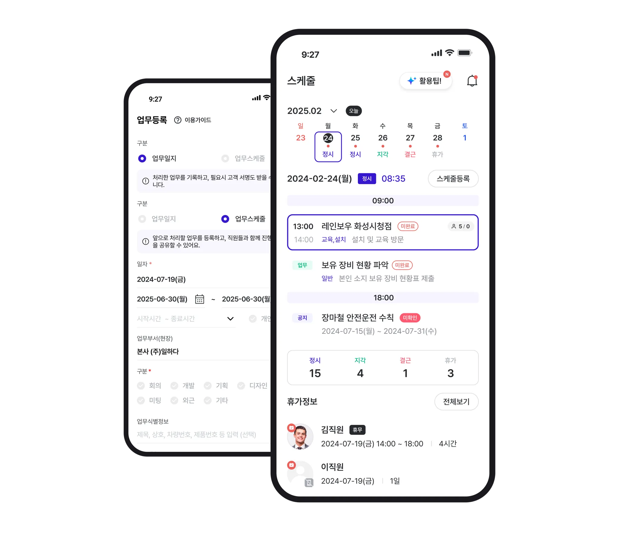 총괄 A이사: 네, 확실히 도움이 되고 있습니다. 예전에는 갑자기 협조를 요청할 일이 생기면 해당 직원을 찾는 것부터가 일이었어요. 사무실을 둘러본다든지, 카톡이나 메신저로 "지금 어디 계세요?"라고 묻거나, 아침에 안 보이는 직원이 있으면 다른 직원에게 "오늘 출근했나요?"라고 물어보는 식이었죠. ERP를 쓸 때도 스케줄 관리 기능은 있었지만, 주로 관리자 중심이어서 직원들끼리 휴무나 업무 일정을 공유하는 데는 한계가 있었습니다. 그러다 보니 휴가 중인 직원에게 연락이 가기도 하고, 업무 지시가 담당자들 사이에서 원활히 공유되지 않아 일이 늘어지거나 우선순위 변경이 제대로 반영되지 않는 경우도 있었죠. 이런 상황은 불필요한 에너지를 쓰게 만들고, 때로는 직원들 사이에서 오해를 낳기도 했습니다.