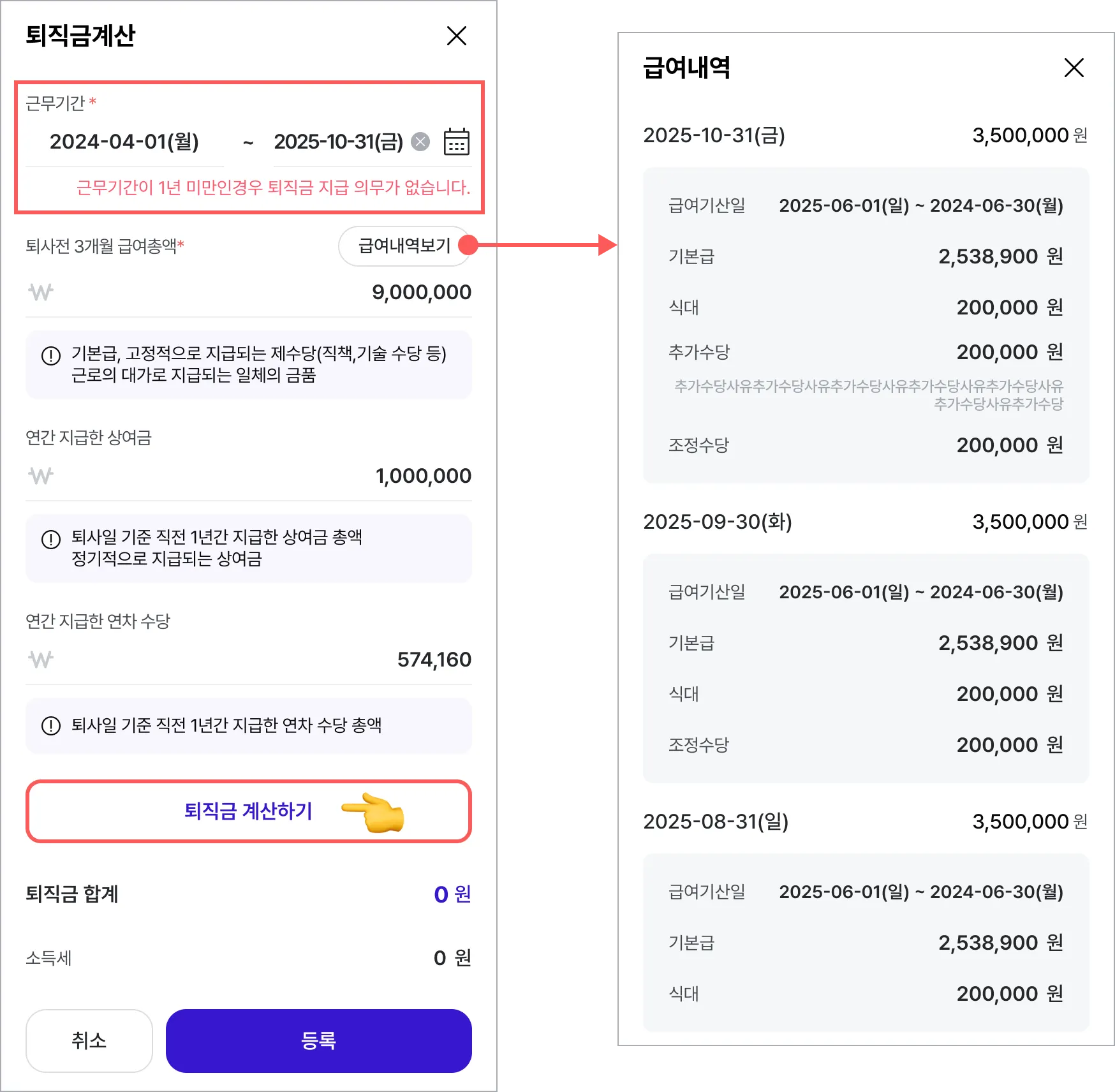 퇴직금 등록 후, 근무기간 하단에서 명세서 버튼을 선택합니다.