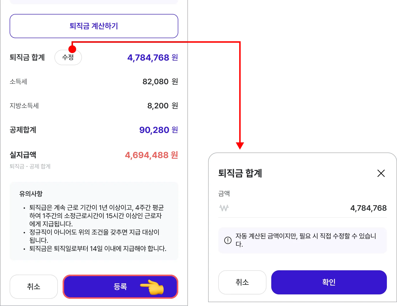 계산된 퇴직금을 확인 후 하단 등록버튼을 눌러 완료합니다.