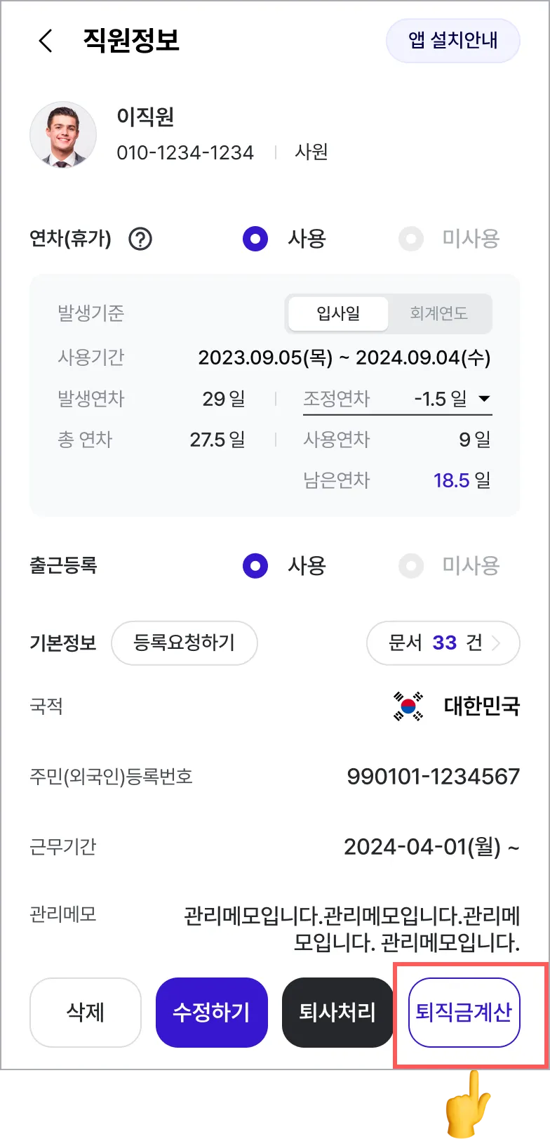 직원정보 하단 퇴직금 계산을 선택합니다.