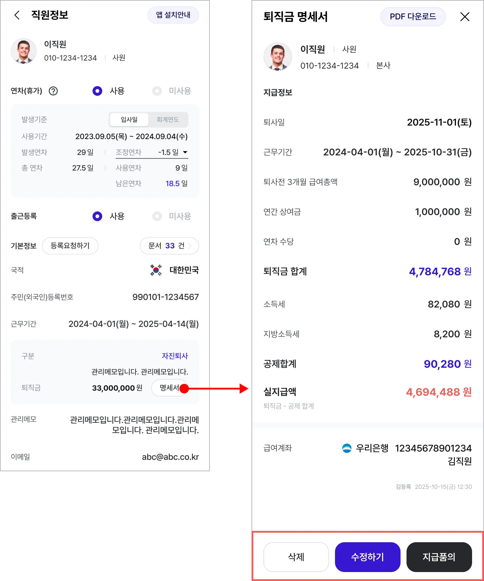 퇴직금 명세서에서 계산된 퇴직금을 수정 또는 삭제하거나 지급품의를 올릴 수 있습니다.