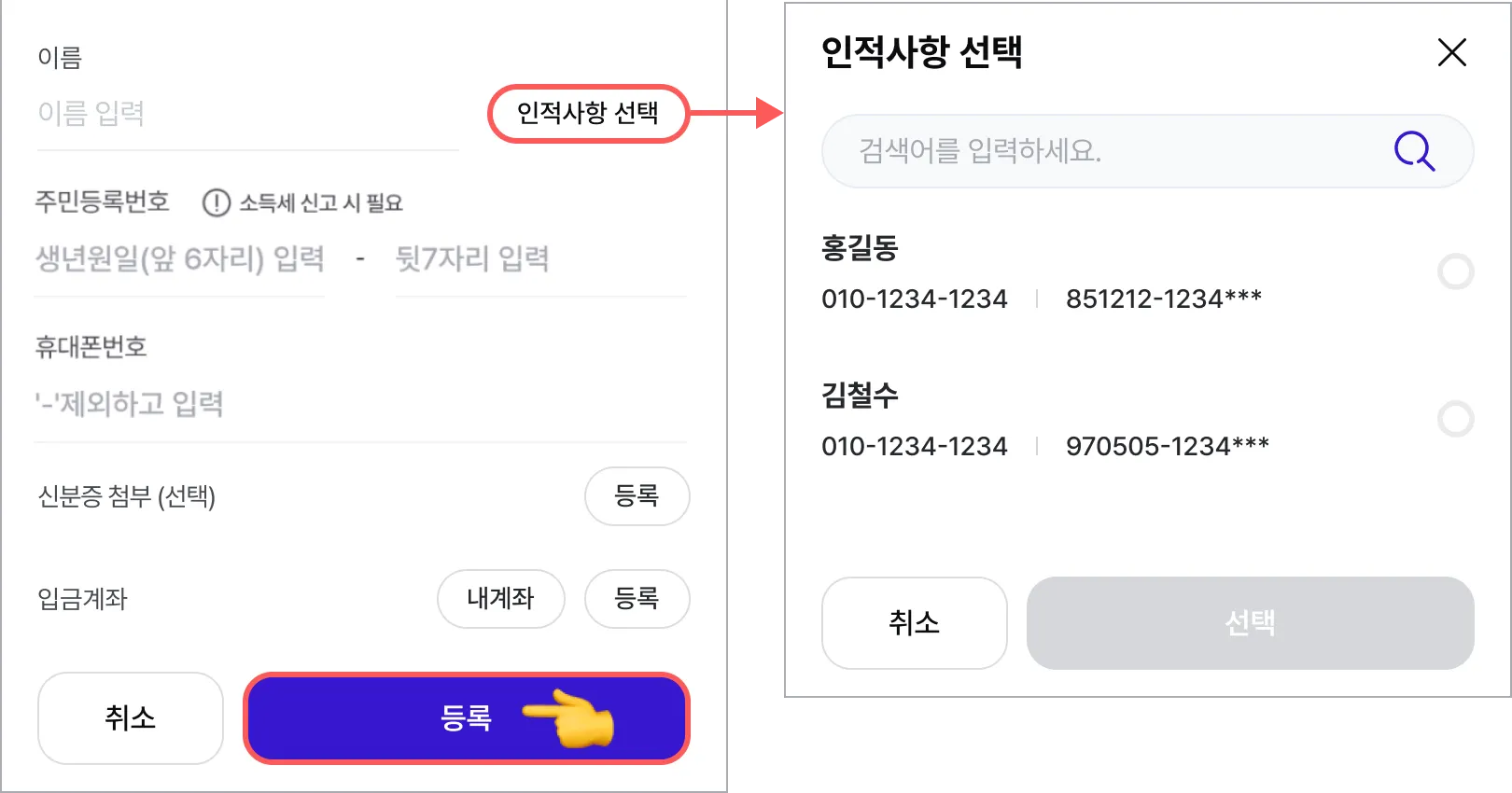 인적사항은 직접 입력 또는 불러오기가 가능하며 신분증 및 입금계좌를 등록할 수 있습니다.