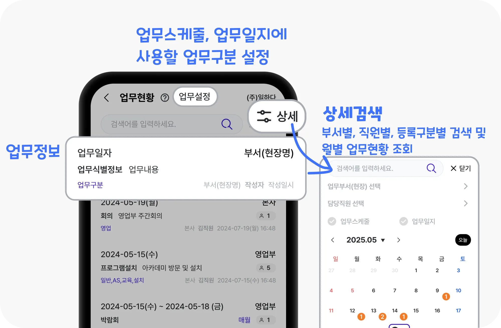 를 한번에 확인하는 메뉴입니다. 부서별, 직원별 등 다양한 기준으로 업무를 조회 할 수 있어요.