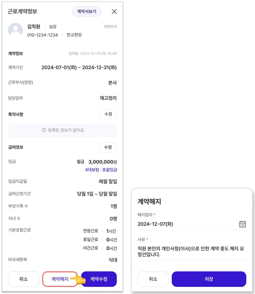 계약기간 만료 전 직원이 퇴사할 경우 사용하는 기능입니다.