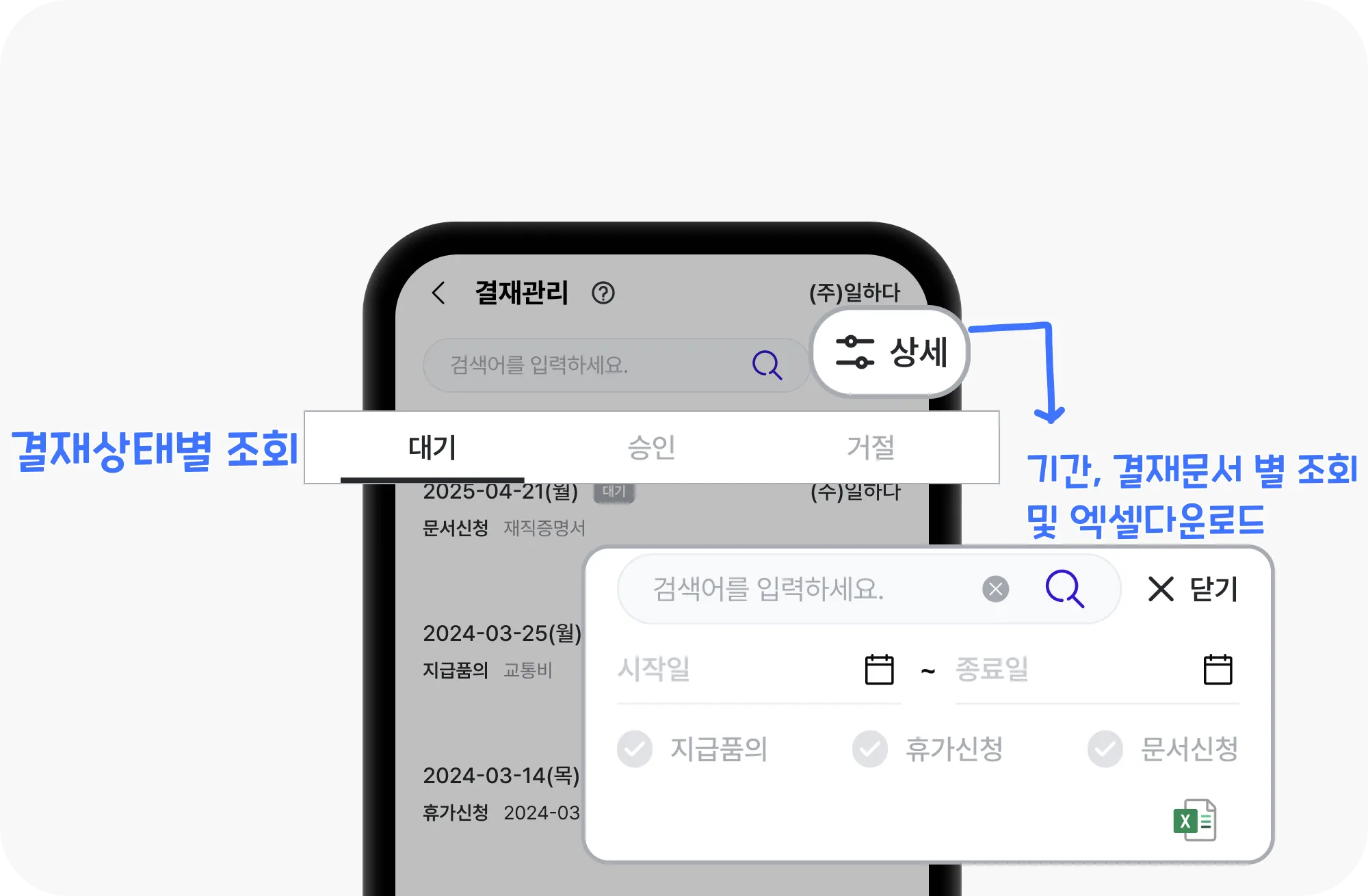 휴가신청, 지급품의, 문서신청 등 직원이 올린 결재 요청을 확인하고 승인/거절 처리합니다.