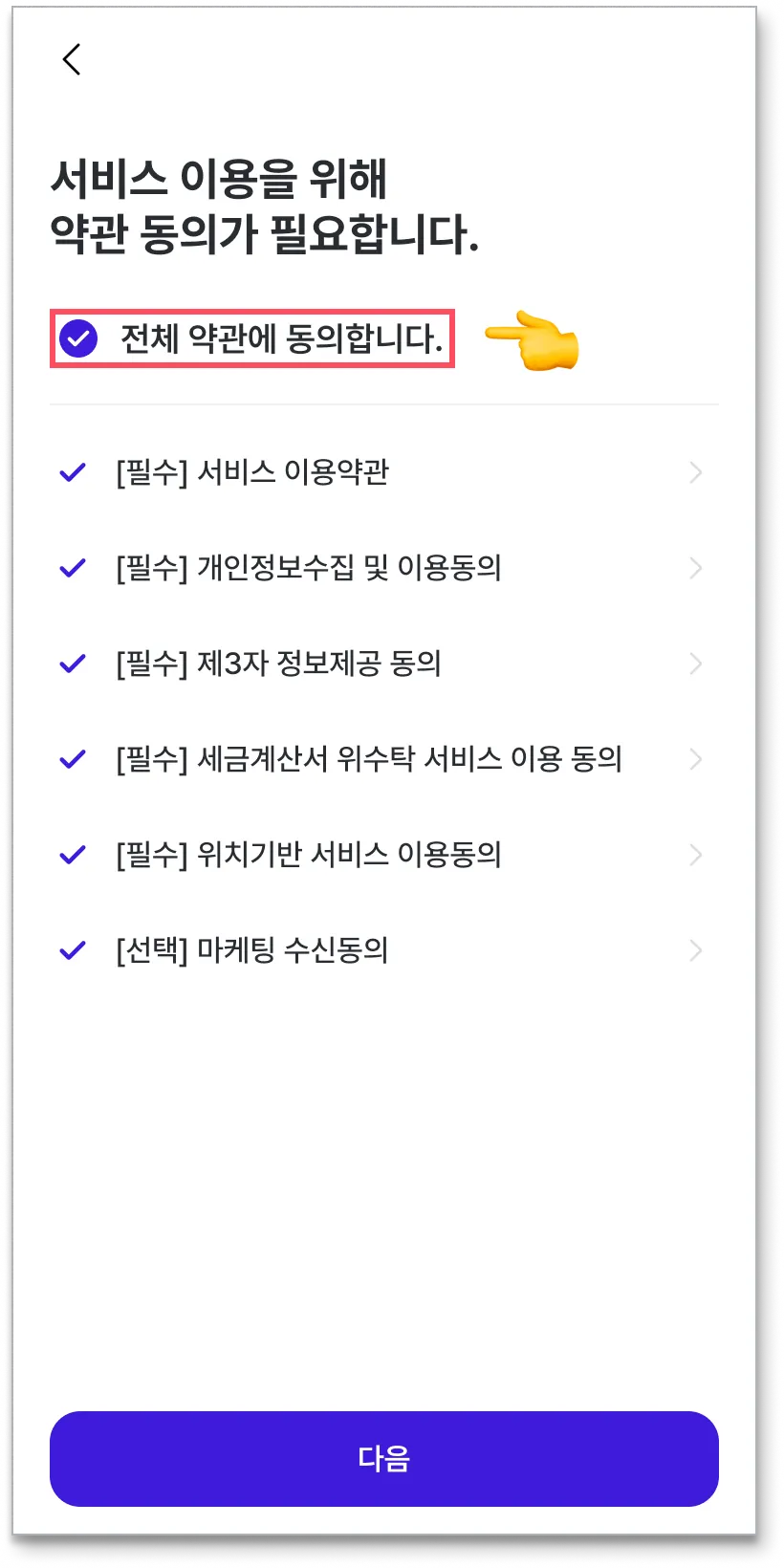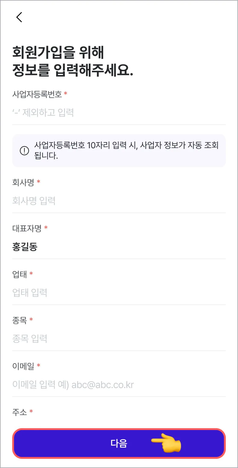 가입에 필요한 정보를 입력 후, ‘다음’ 을 눌러 가입을 완료합니다.