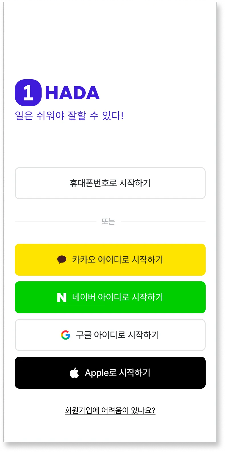회원가입에 문제가 발생한다면, 하단 ‘회원가입에 어려움이 있나요?’ 를 눌러주세요.