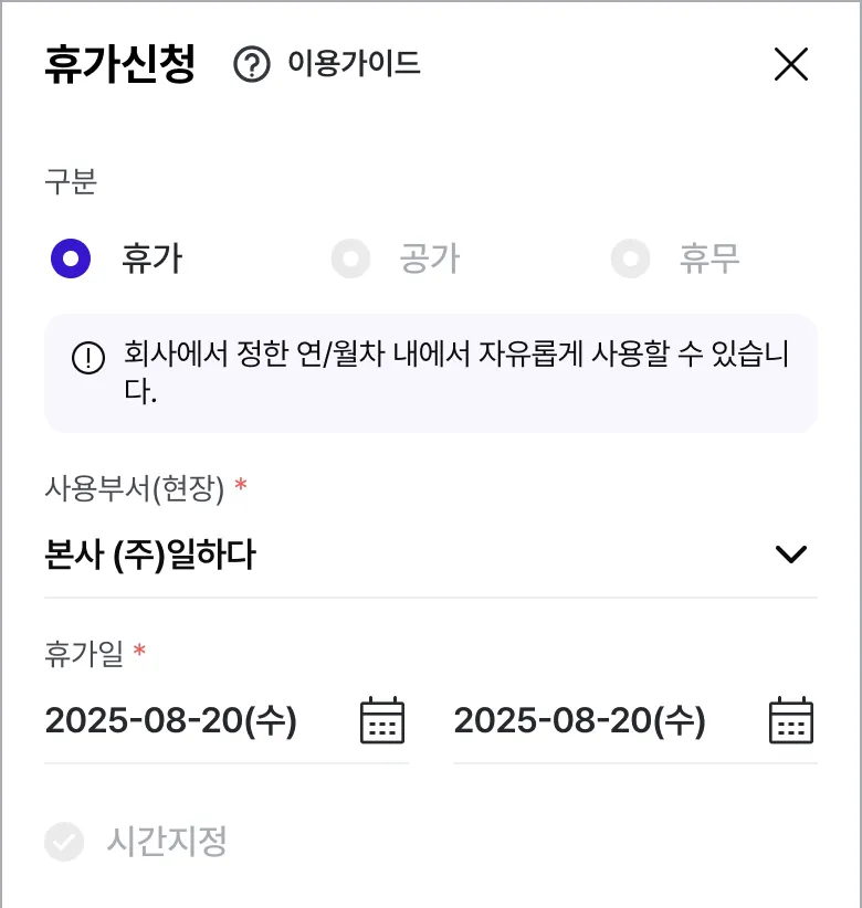 휴가일이 1일 일 경우, 시간지정을 눌러 시간단위 부분연차 신청도 가능합니다.