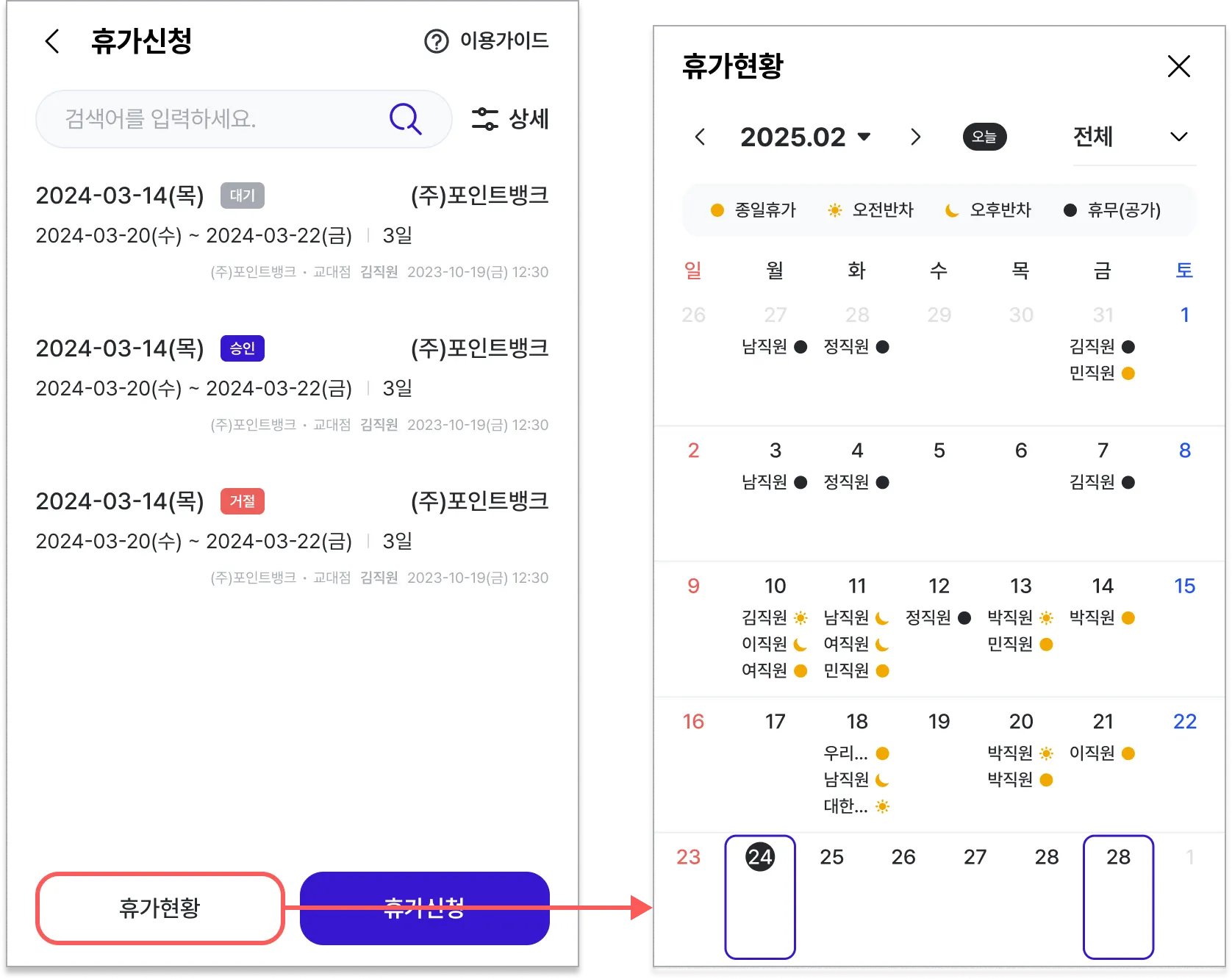 [휴가신청] 하단의 ‘휴가현황’에서 모든 직원의 휴가 사용 현황을 확인할 수 있습니다.