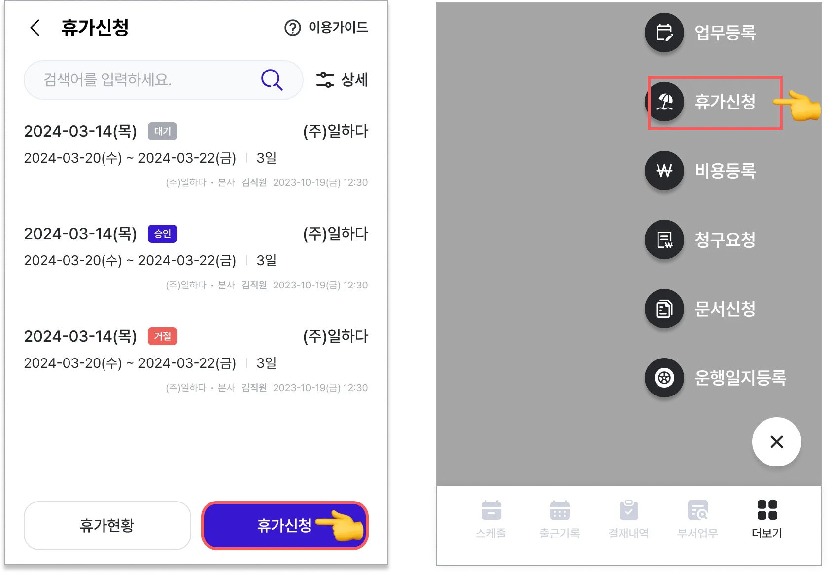 더보기 > 마이페이지 [휴가신청] 하단의 ‘휴가신청’을 선택하거나